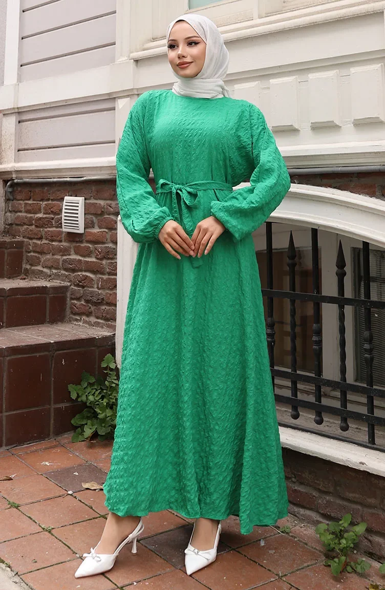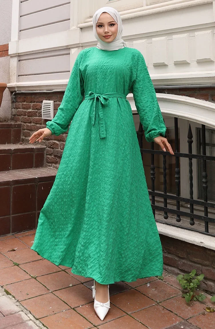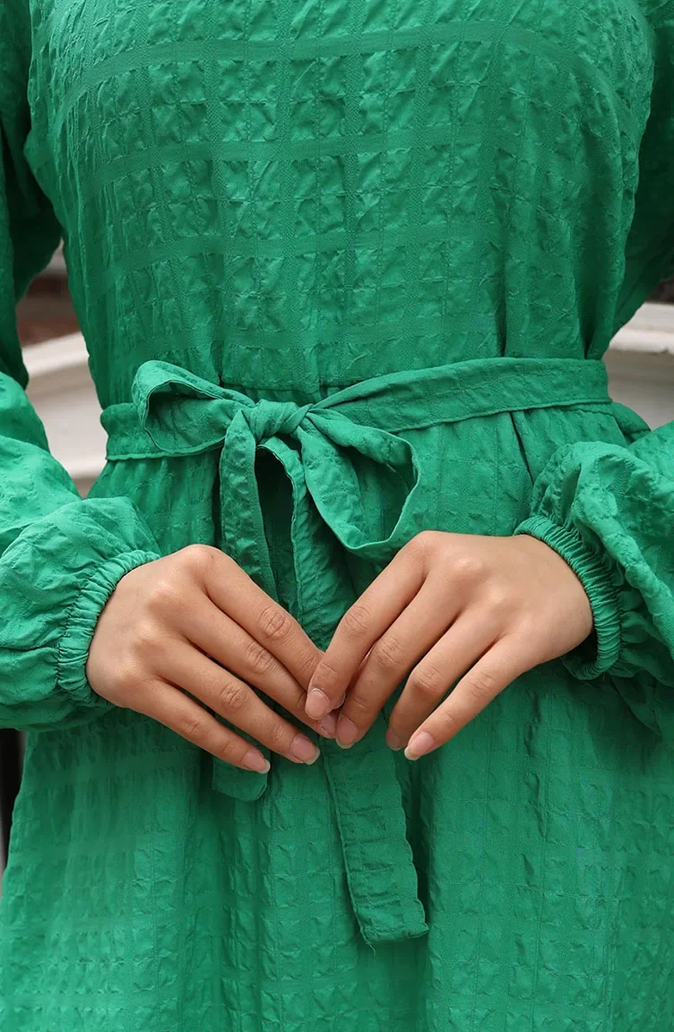 Gofre Kumaş Kolu Lastikli Kuşaklı Elbise 2020-05 Yeşil
