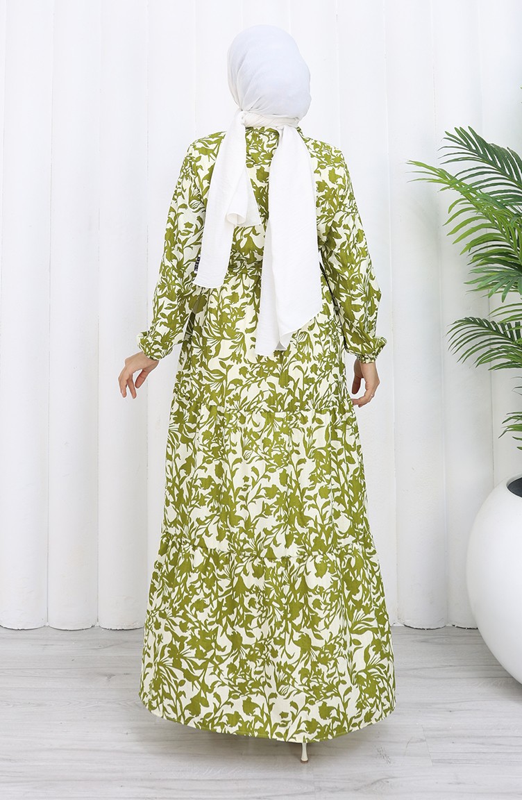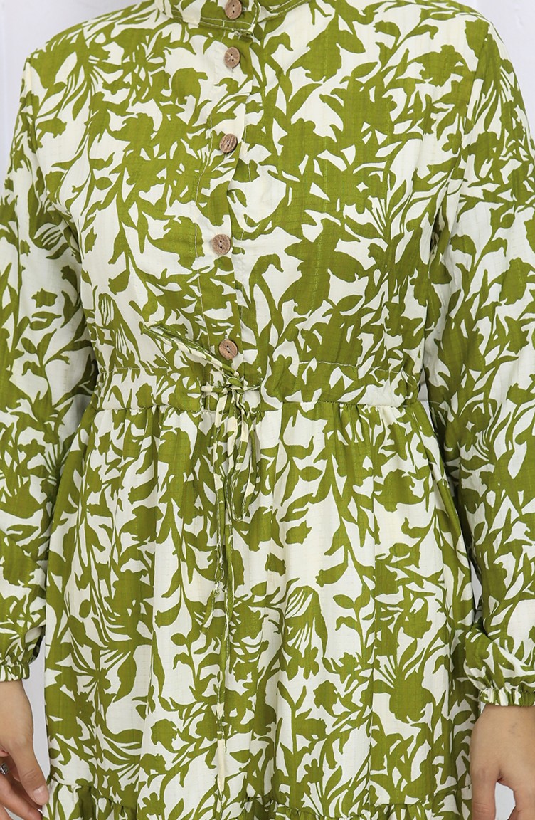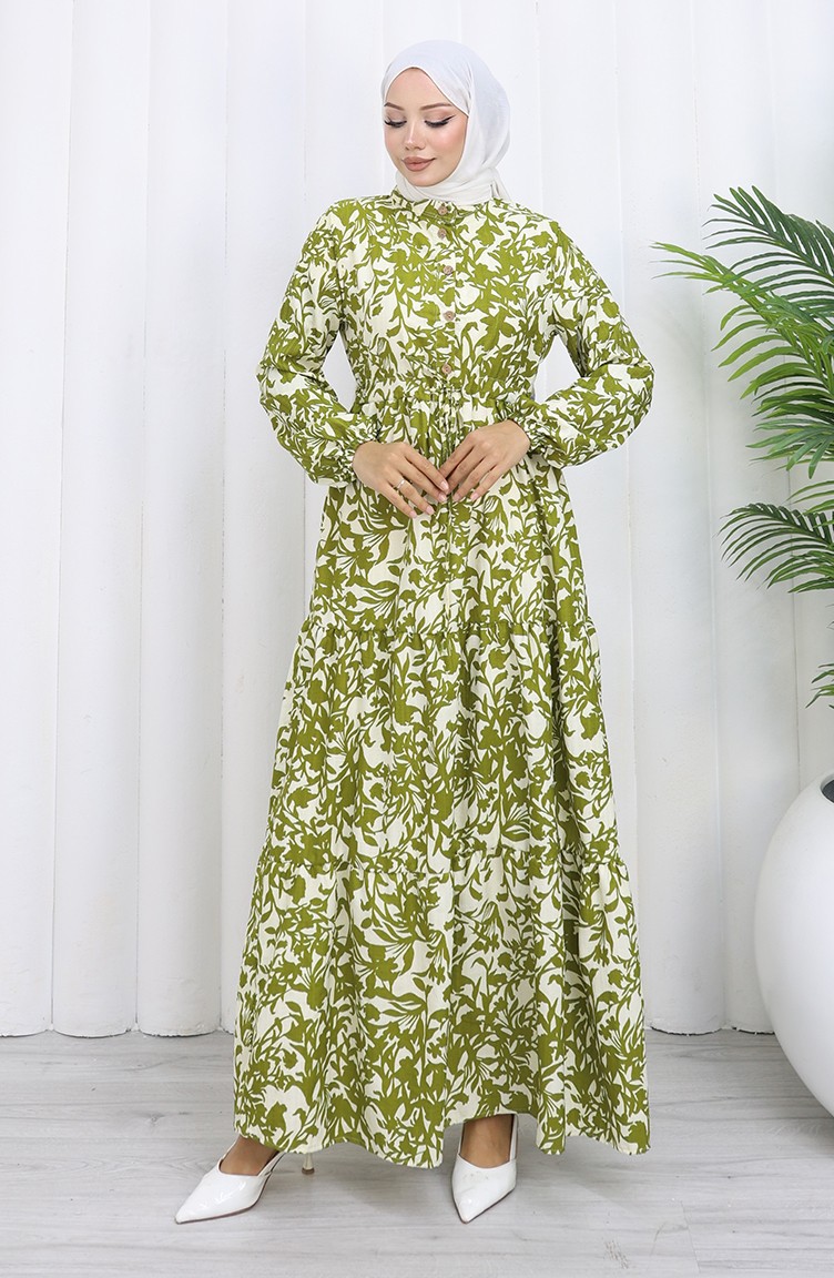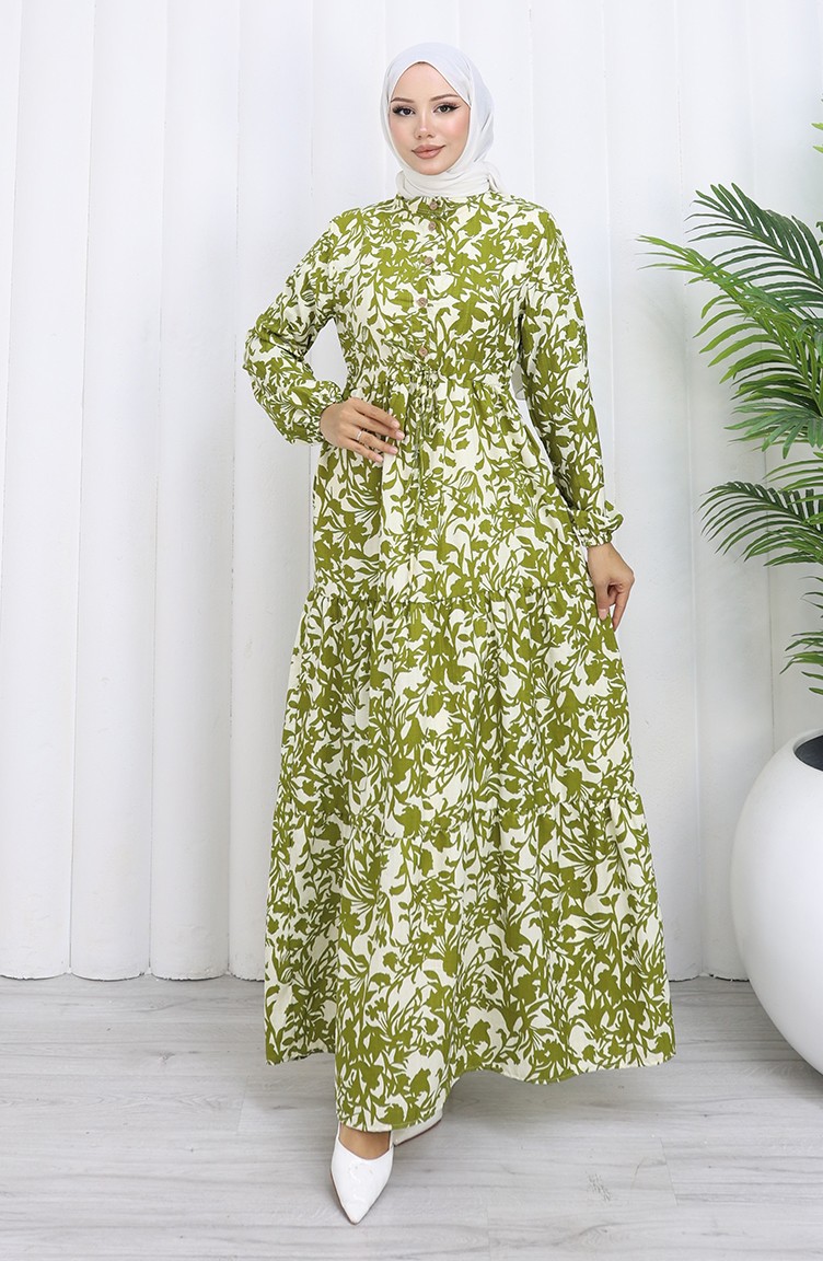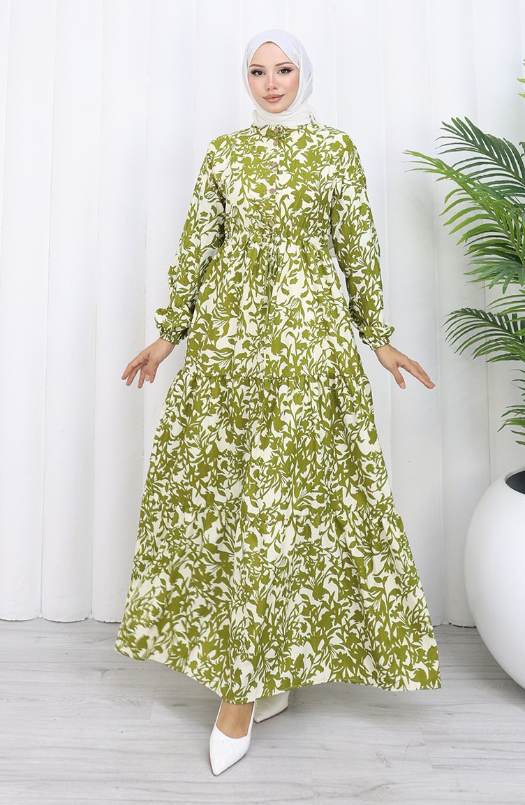 Hakim Yaka Beli Bağcıklı Desenli Elbise 0190-01 Haki