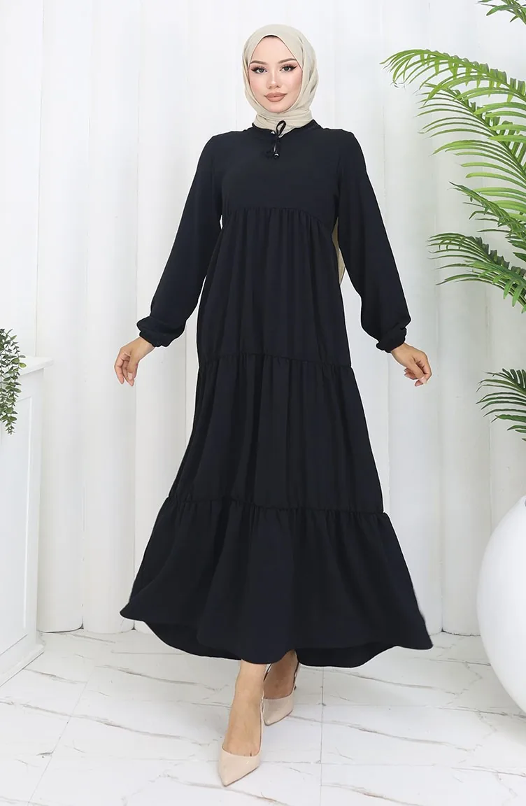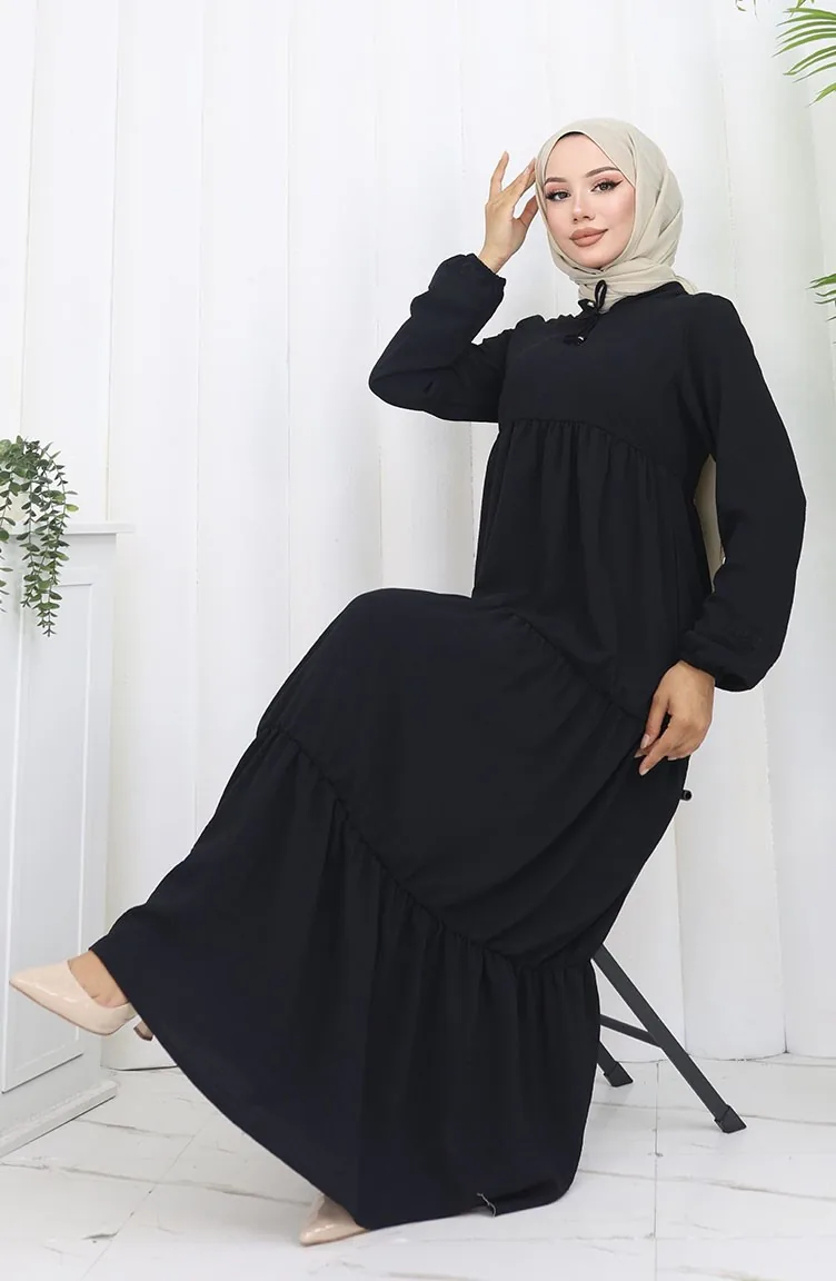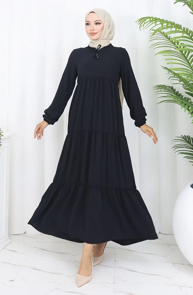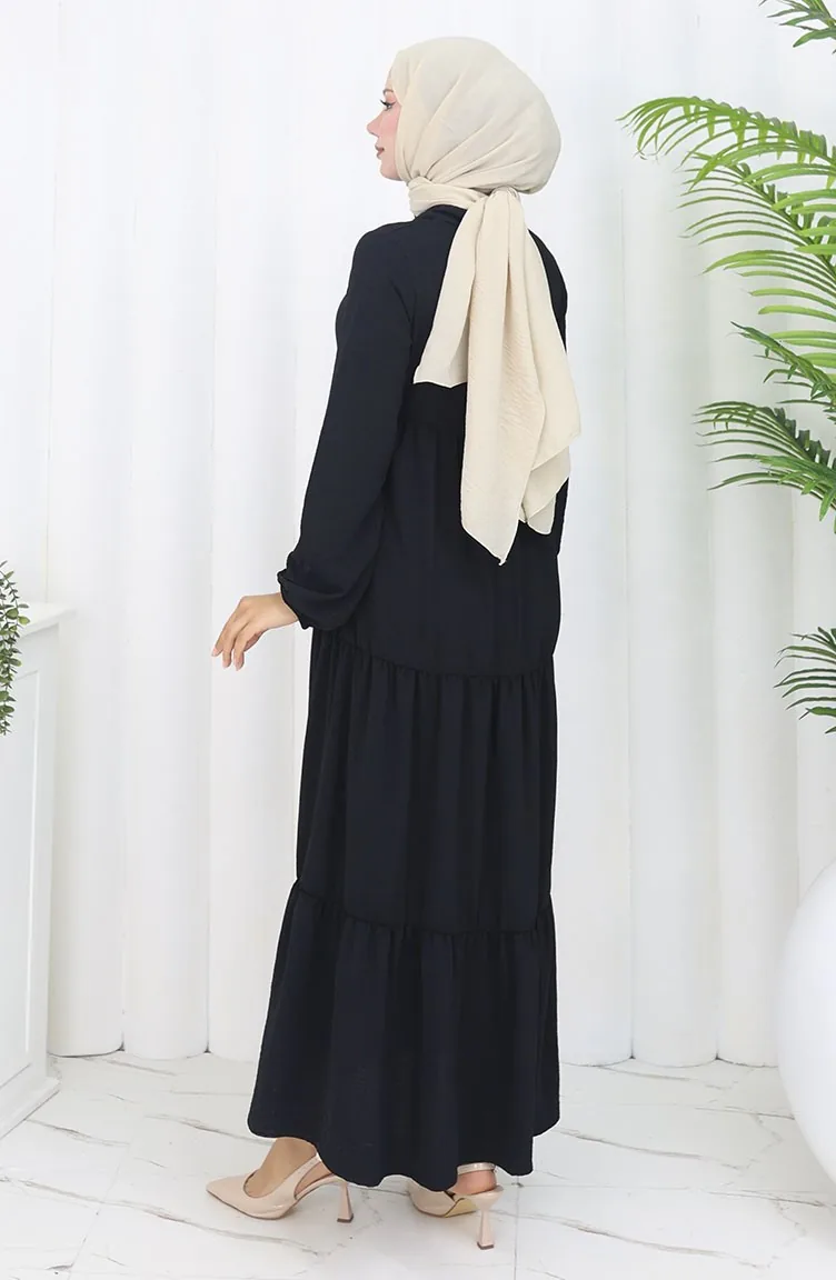İnci Ayrobin Farbalı Kolları Lastikli Elbise 4909-10 Siyah