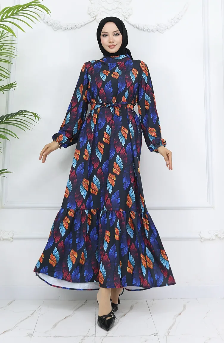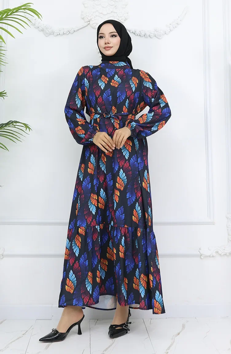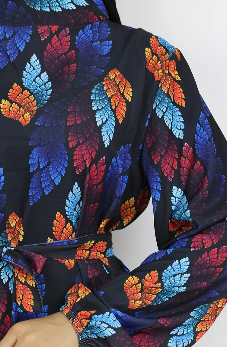 Jessica Kumaş Desenli Elbise 0033-03 Siyah Turkuaz