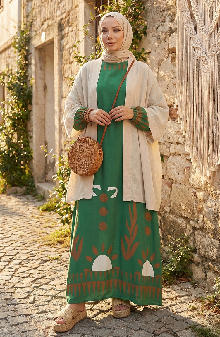 Hijab (tesettür) stilinde modern ve enerjik bir parça: yeşil-siyah desenli elbise. Modest dress (elbise) koleksiyonunuza canlılık katan bu islamic clothing (İslami giyim) parçası, sade bir sıfır yaka ile dengelenmiştir. Dökümlü Viskon Kumaşı (Pamuk/Polyester karışımlı) sayesinde 4 Mevsim (mevsimlik) kullanımda terletmez.