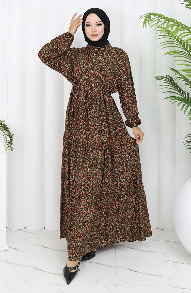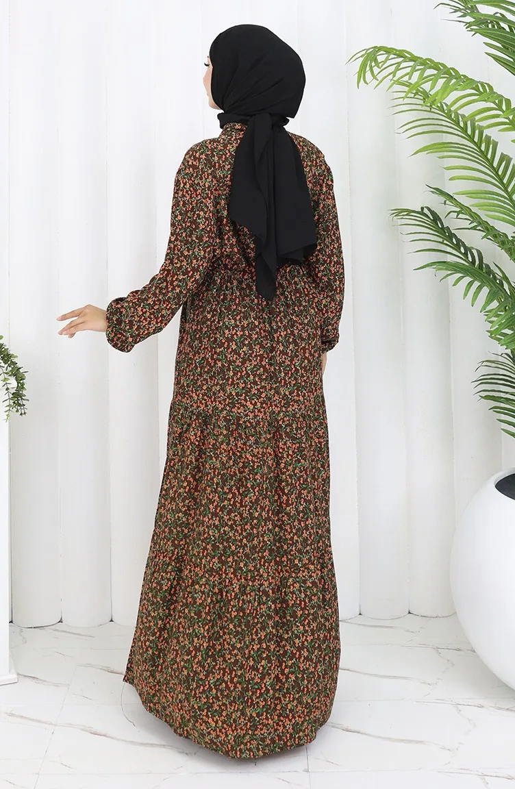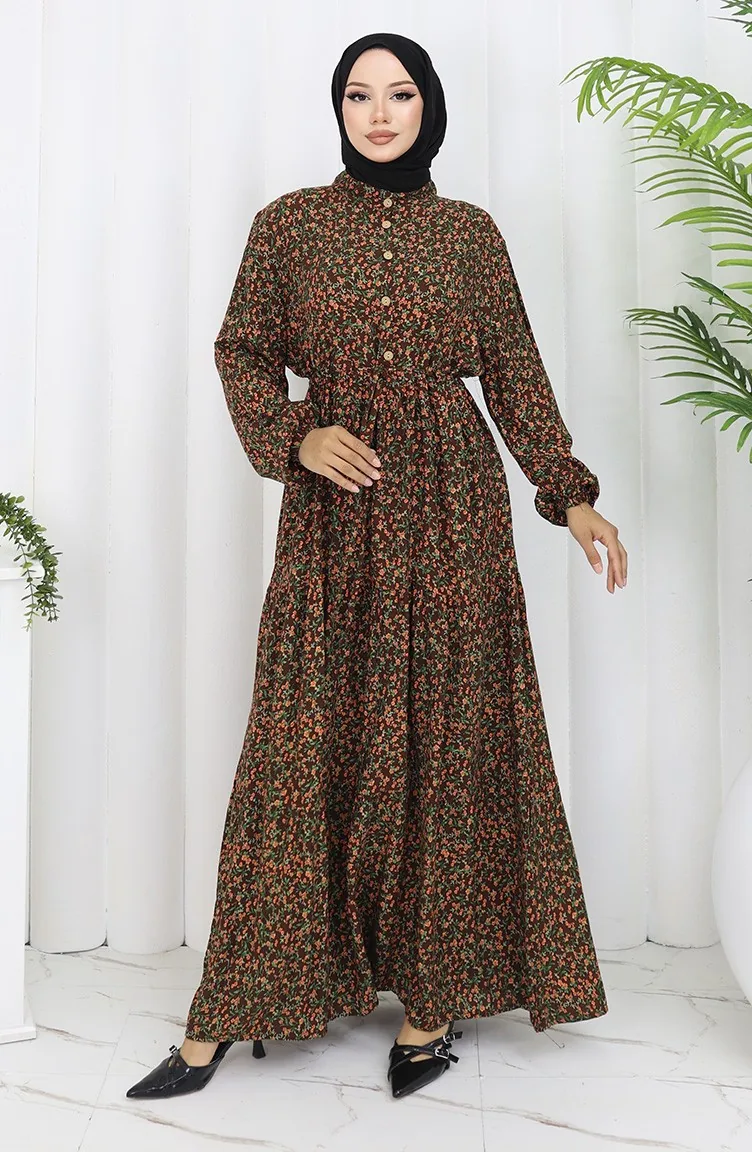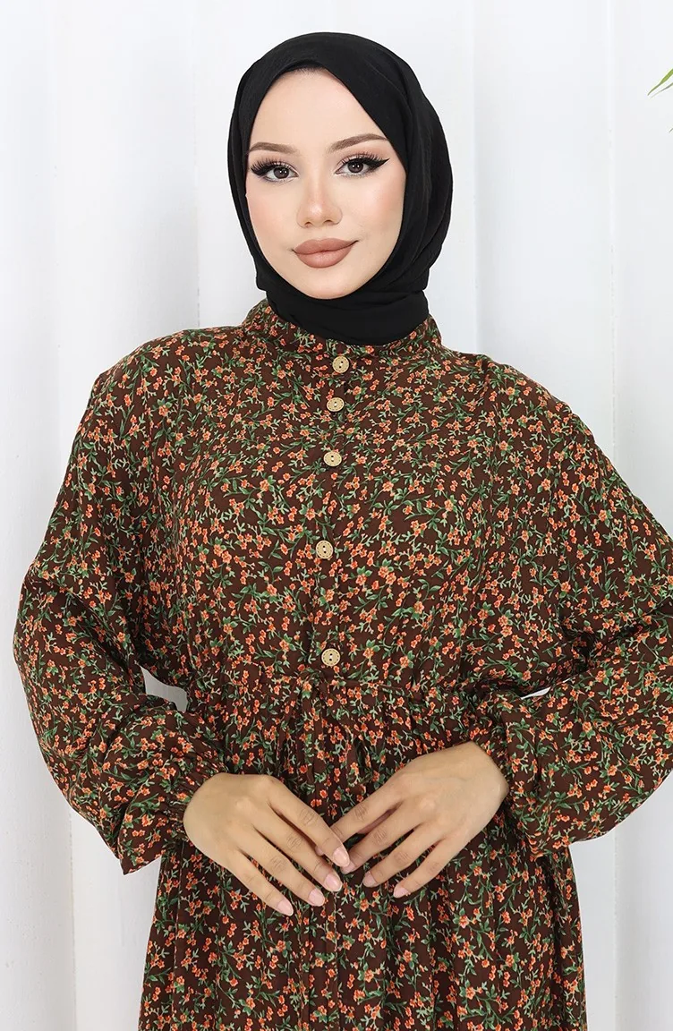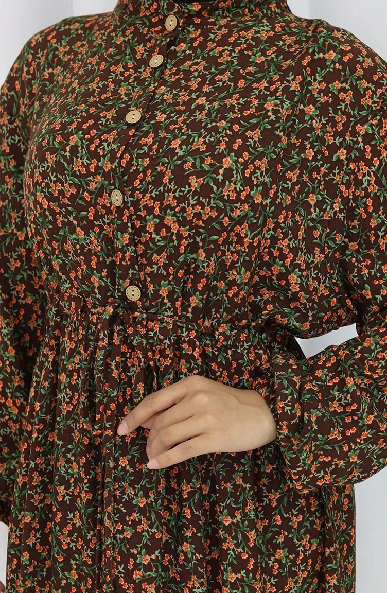 Kolu lastikli Desenli Elbise 2057-01 Kahverengi