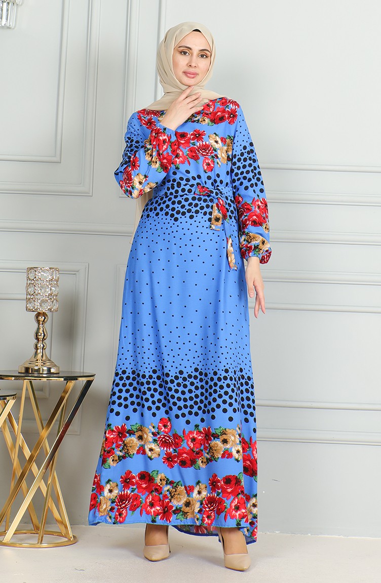 Kolu lastikli Desenli Kuşaklı Viskon Elbise 0494-01 İndigo