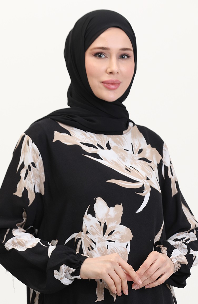 Kolu lastikli Desenli Viskon Elbise 0016-02 Siyah Sütlü kahve