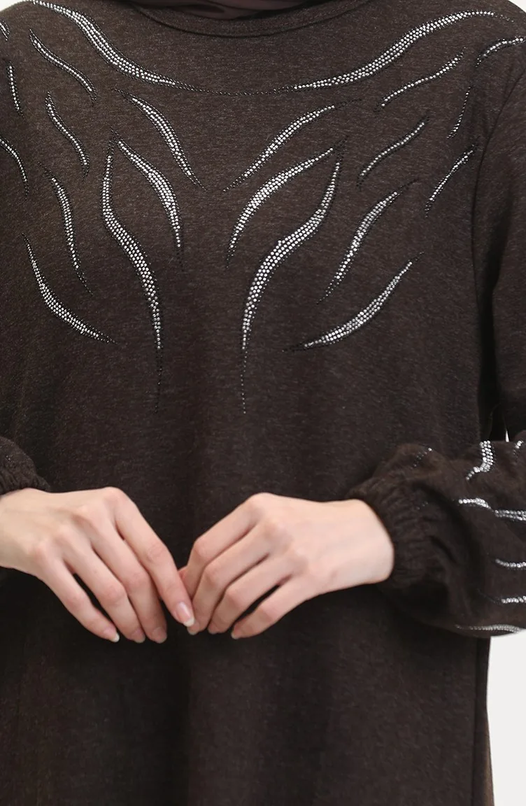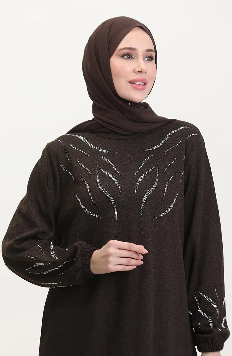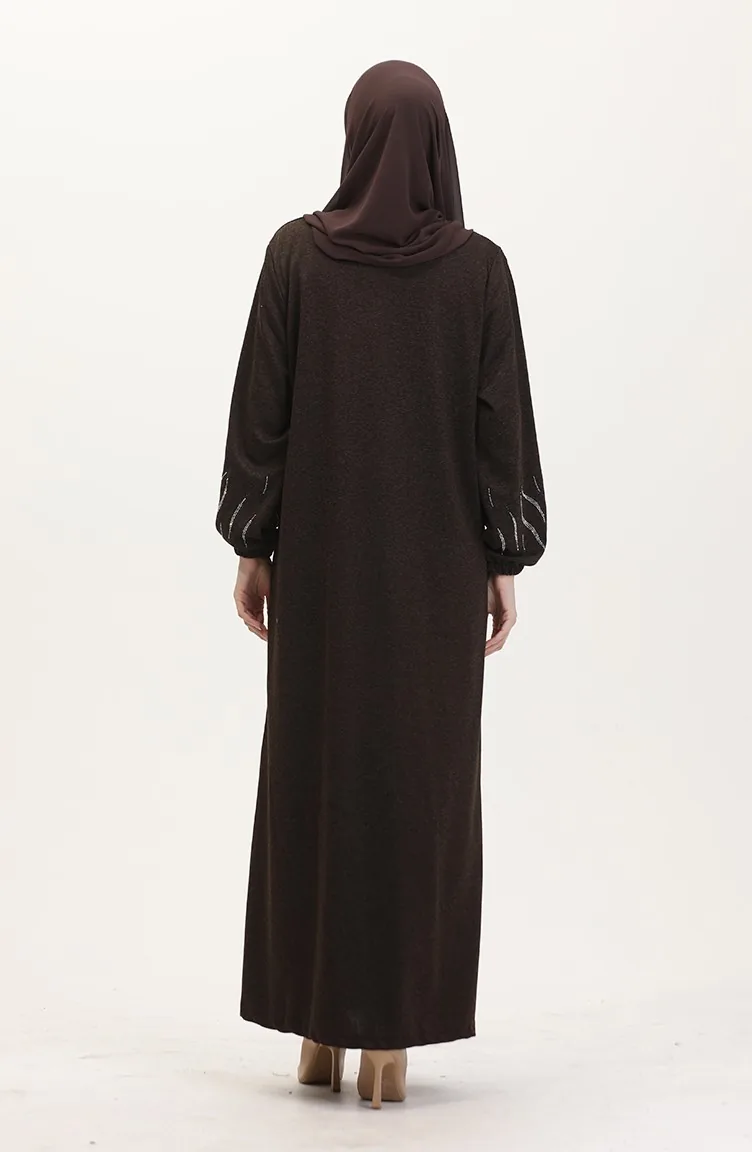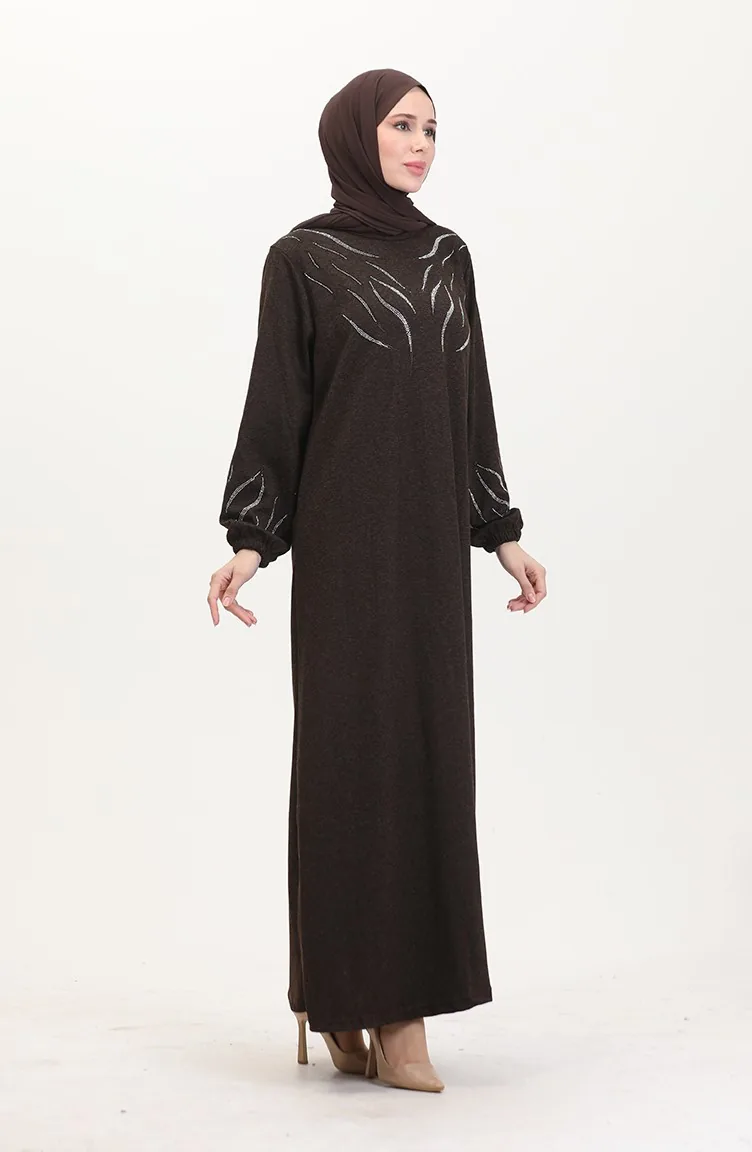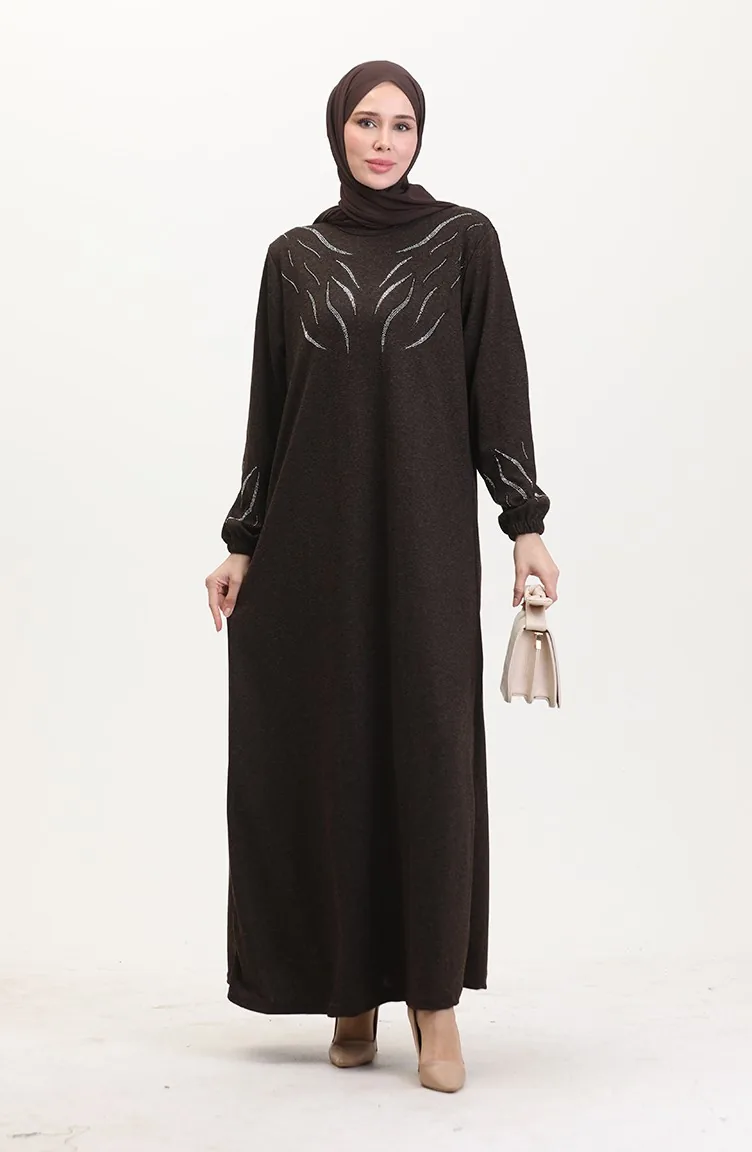 Kolu Lastikli Taşlı Elbise 0547-05 Kahverengi
