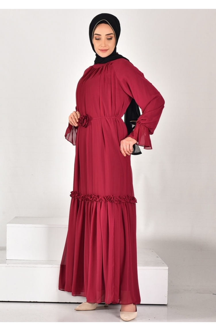 Kolu fırfır detaylarıyla zarif bir görünüm sunan bu şifon kumaş tesettür elbise, şıklığınızı ön plana çıkarır. Akışkan yapısı, rahat bir kullanım sağlarken hareket özgürlüğü sunar. Hem özel davetlerde hem de günlük hayatta şık bir tercih olarak öne çıkar.