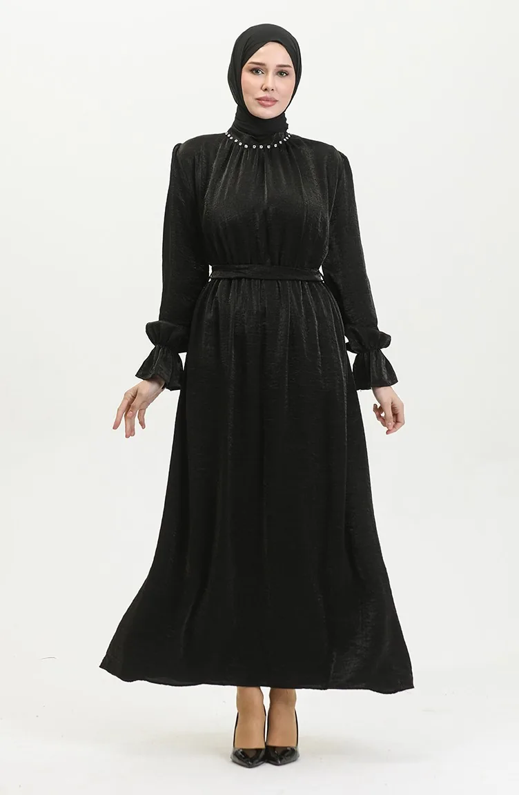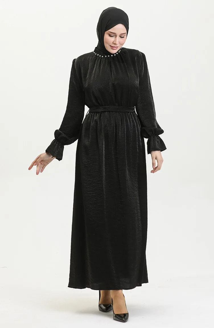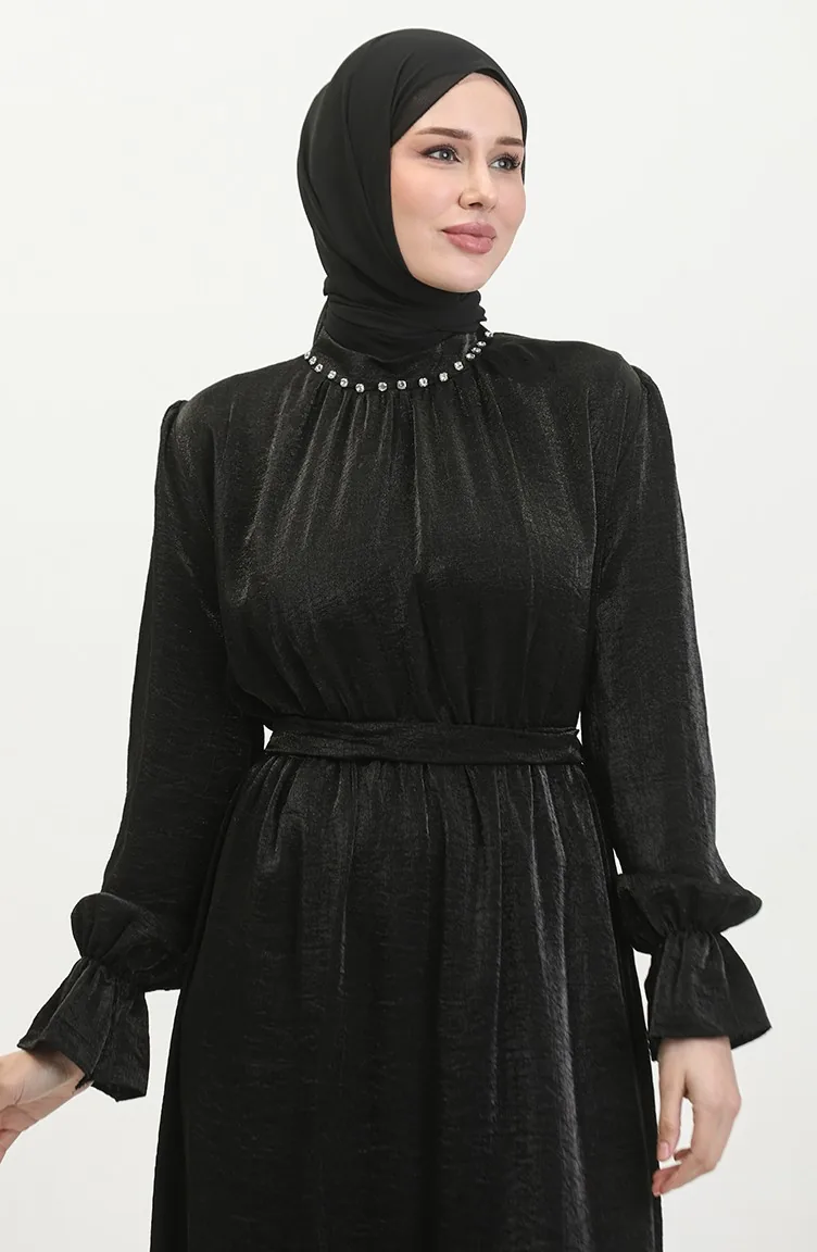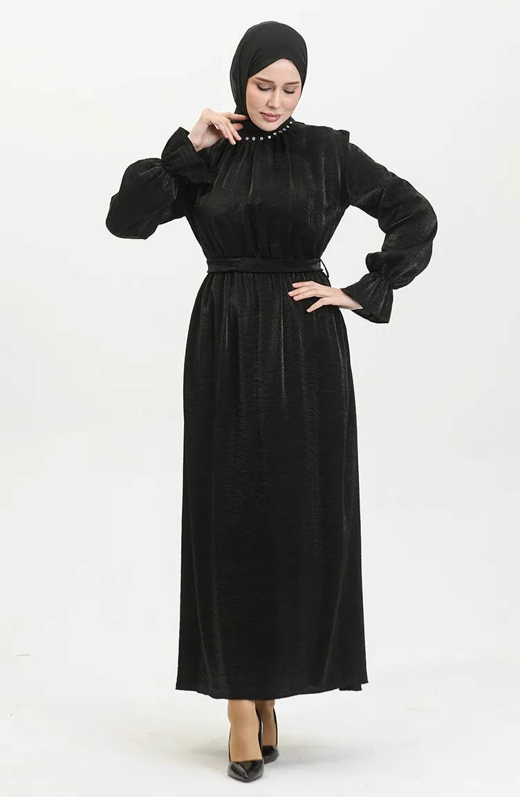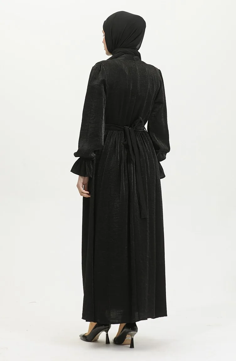 Simli Keten Kuşaklı Elbise 81853-03 Siyah