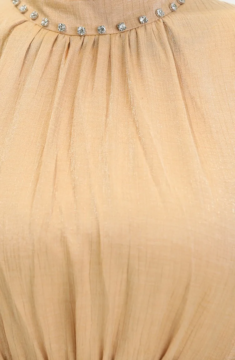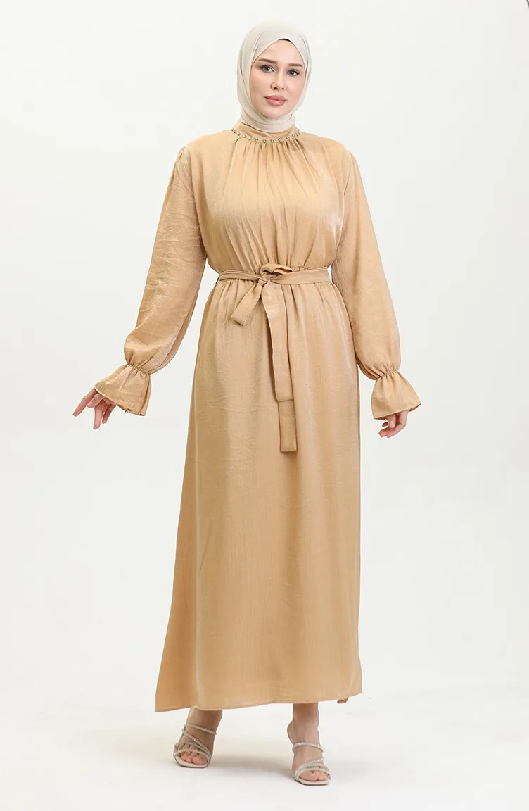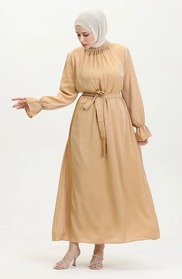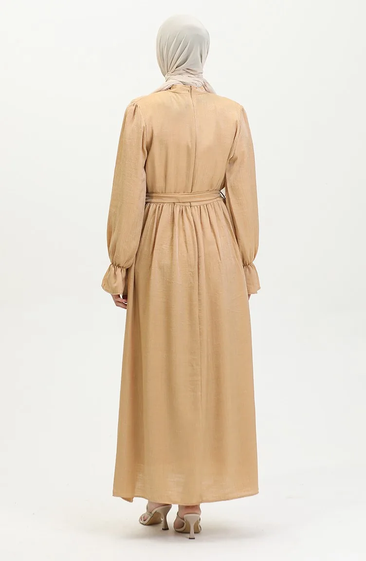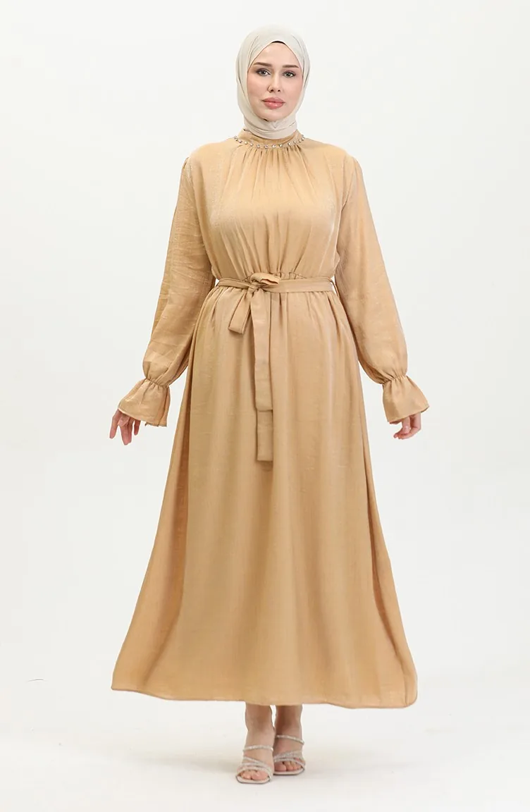 Simli Keten Kuşaklı Elbise 81853-06 Hardal