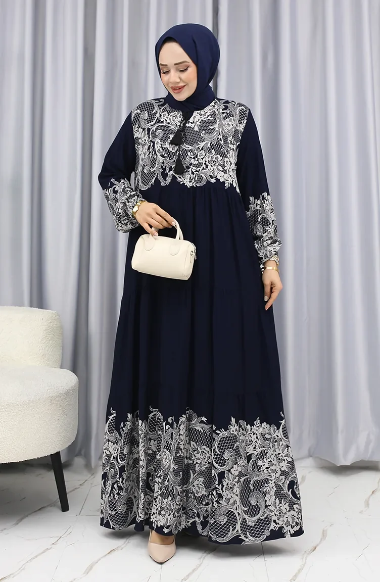 Sulu Desen Elbise 4082-03 Lacivert Beyaz