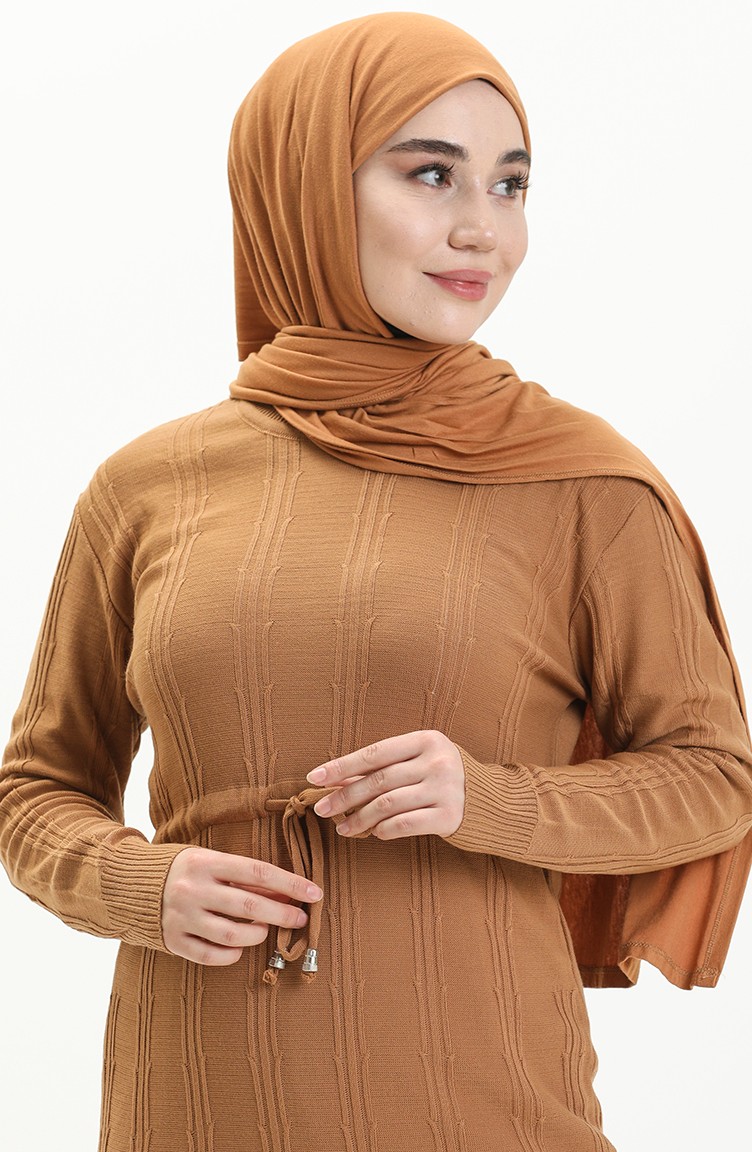 Triko Beli Büzgülü Elbise 3030-07 Sütlü kahve