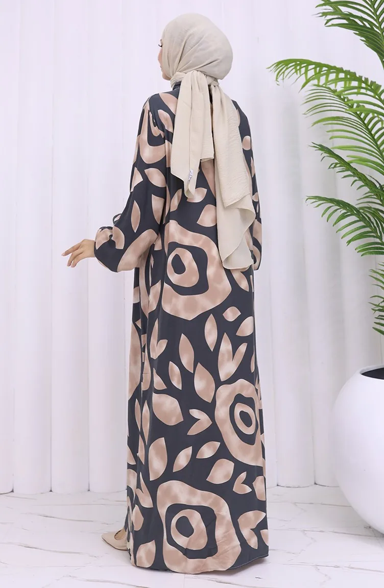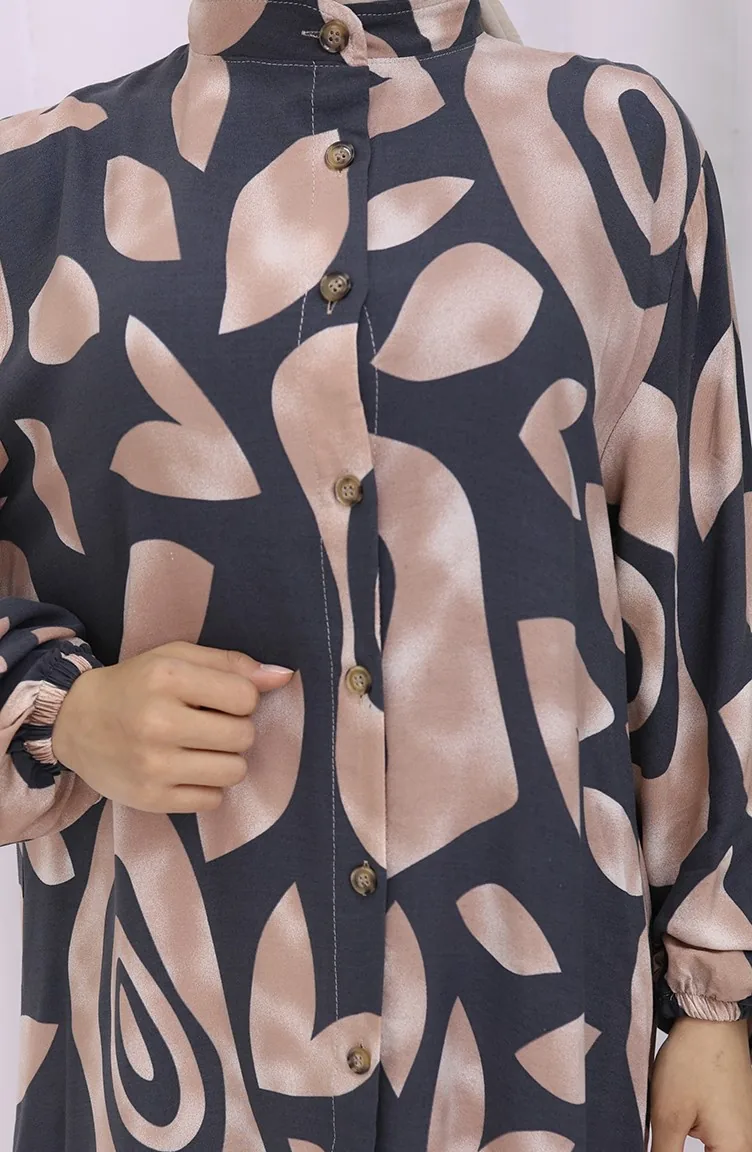 Viskon Kumaş Boydan Düğmeli Desenli Elbise 2029-03 Vizon Antrasit