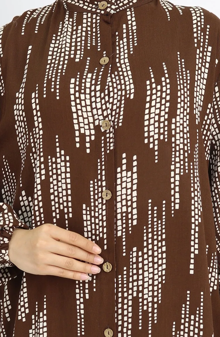 Kahverengi renktedir. Viskon kumaş. Desenli kumaş. Astarsız. Lastik kollu. Hakim yaka detayı ile kullanışlı modeldir. 4 Mevsim tercih edebilirsiniz. Rahat. Büyük beden seçeneği mevcuttur.