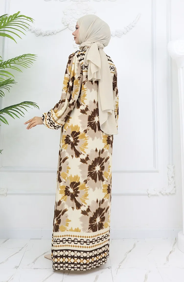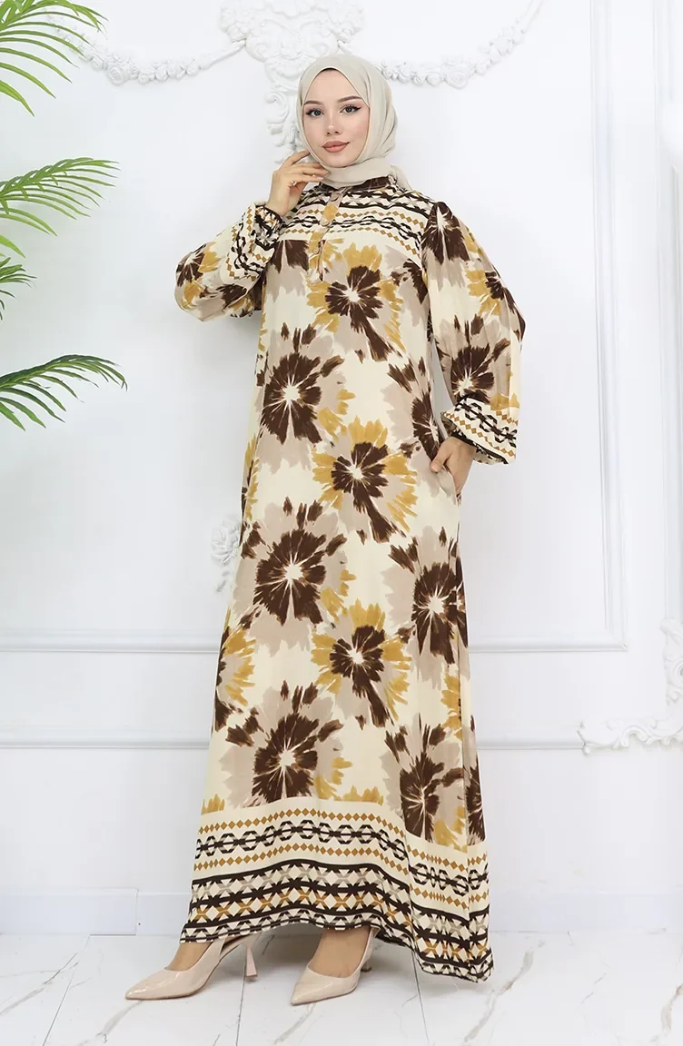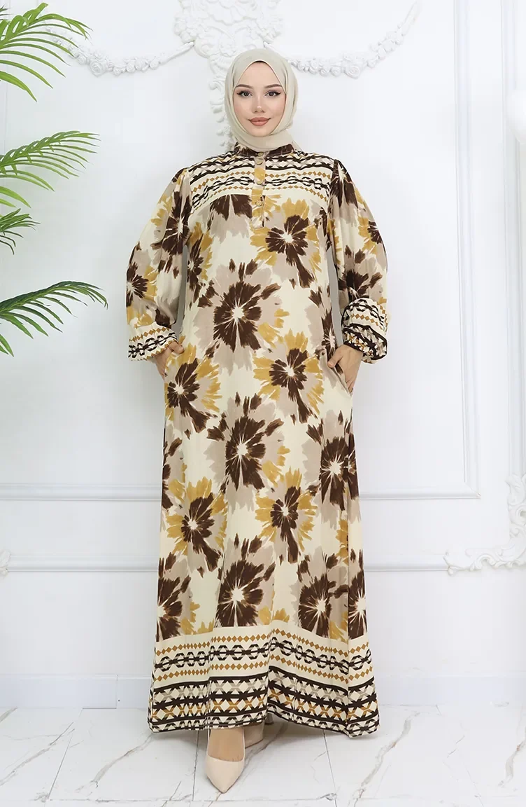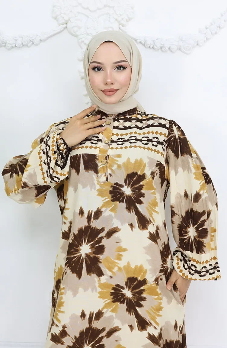 Viskon Kumaş Desenli Düğmeli Elbise 2001-01 Bej Vizon