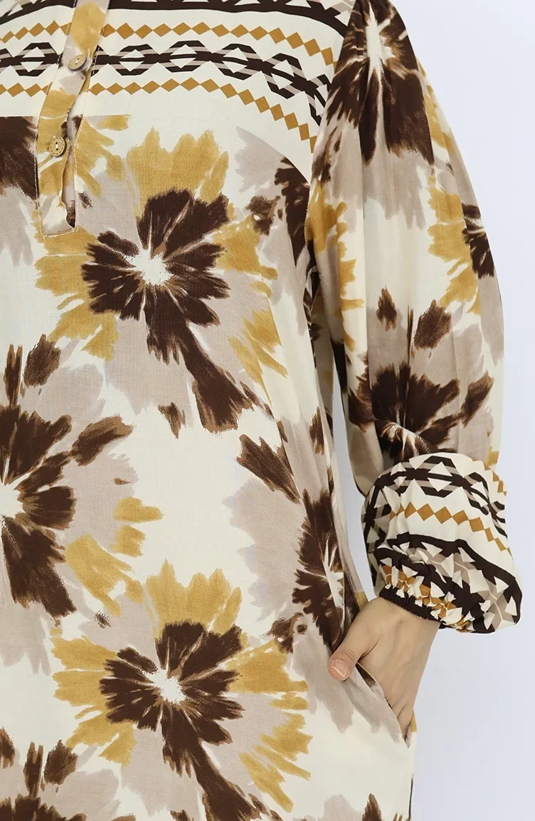 Bej renktedir. Viskon kumaş. Desenli kumaş. Düğmeli. Lastik kollu. Hakim yaka detayı ile kullanışlı modeldir. 4 Mevsim tercih edebilirsiniz. Rahat. Büyük beden seçeneği mevcuttur.