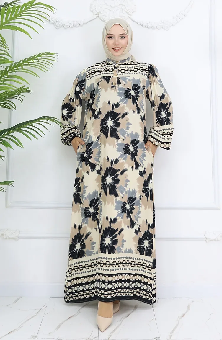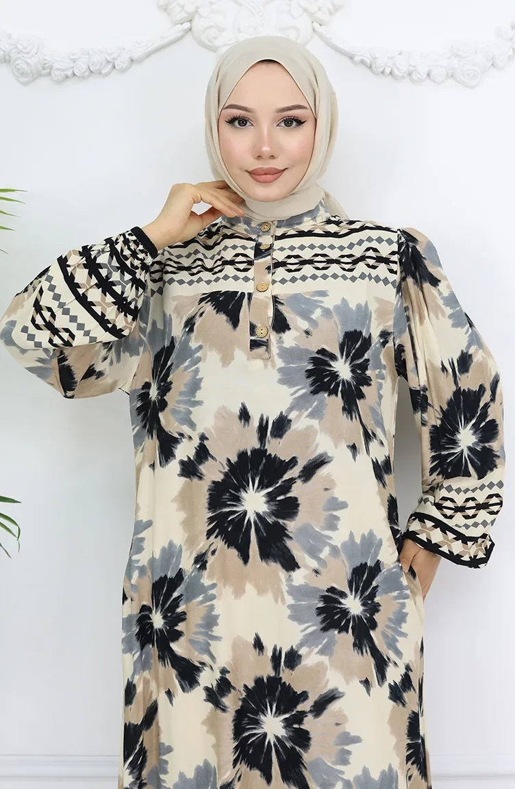 Bej renktedir. Viskon kumaş. Desenli kumaş. Düğmeli. Lastik kollu. Hakim yaka detayı ile kullanışlı modeldir. 4 Mevsim tercih edebilirsiniz. Rahat. Büyük beden seçeneği mevcuttur.