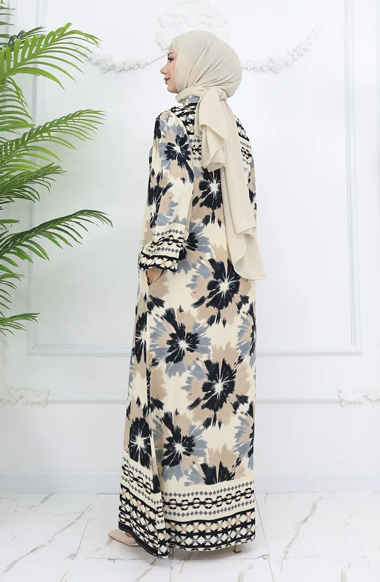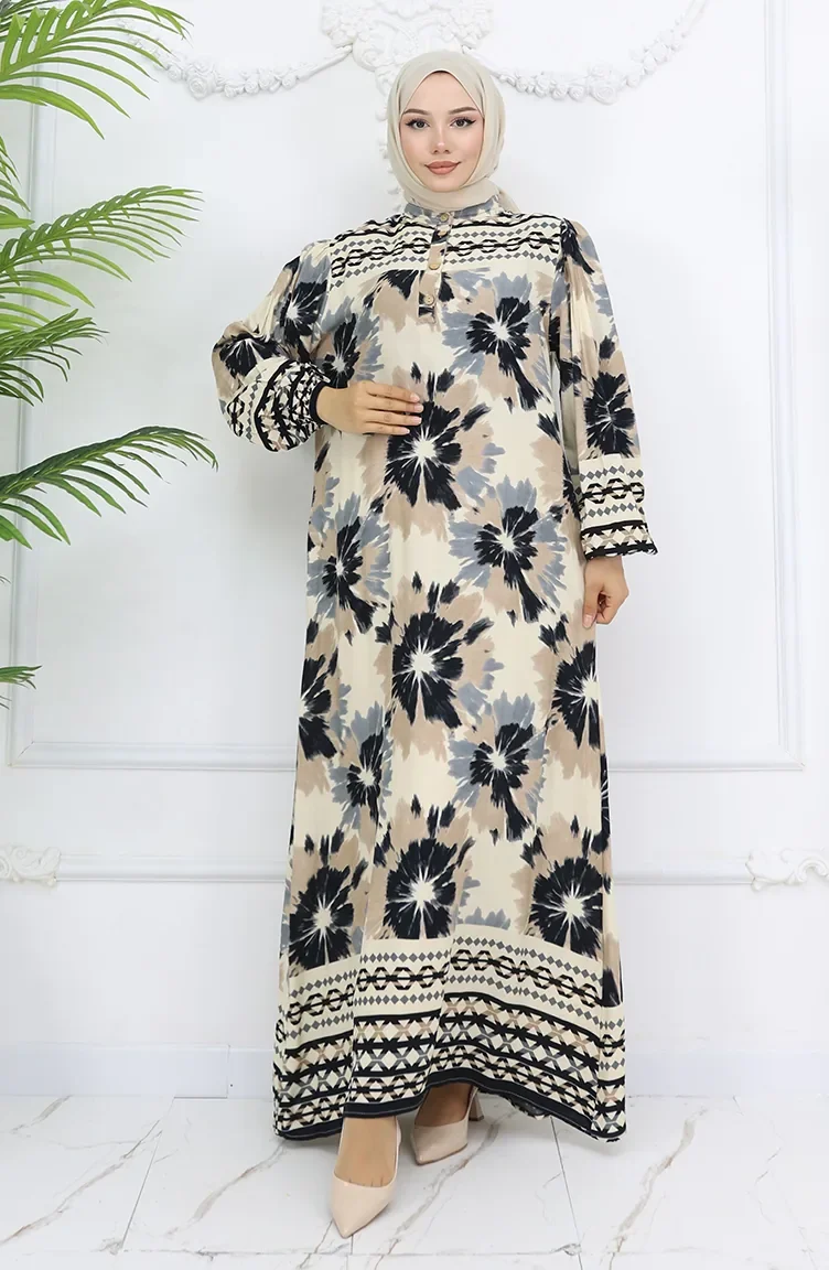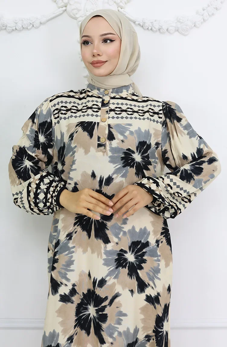 Viskon Kumaş Desenli Düğmeli Elbise 2001-03 Bej Siyah