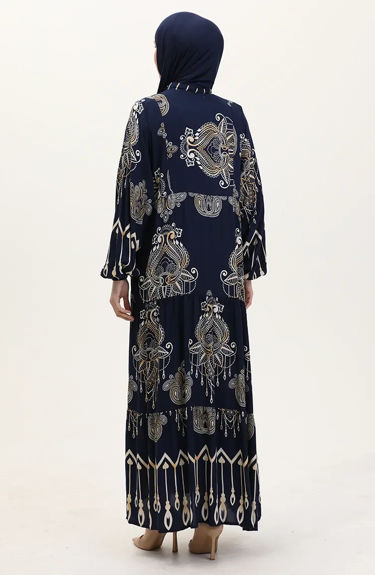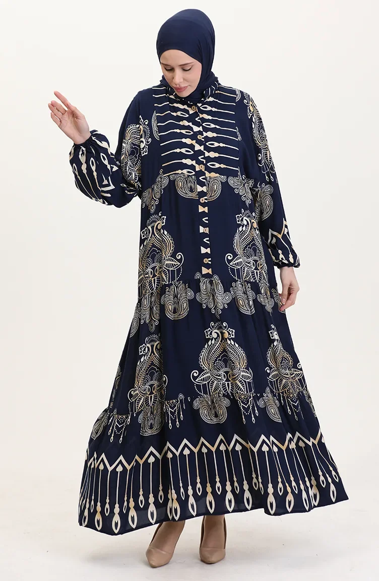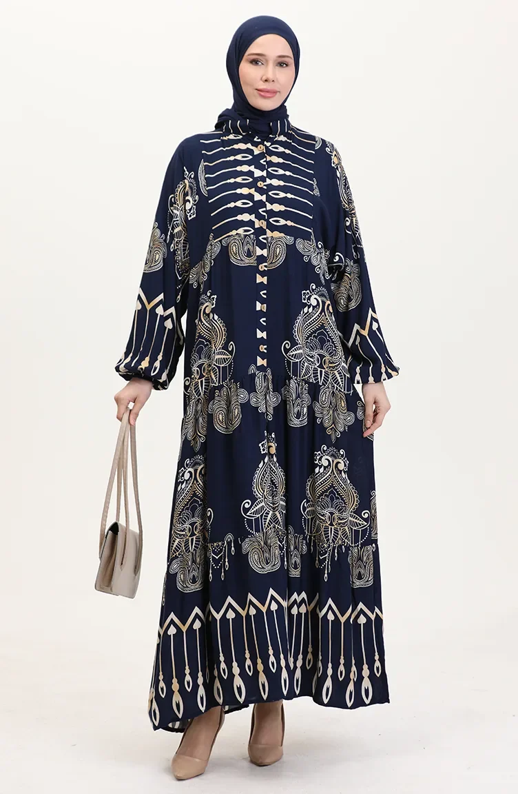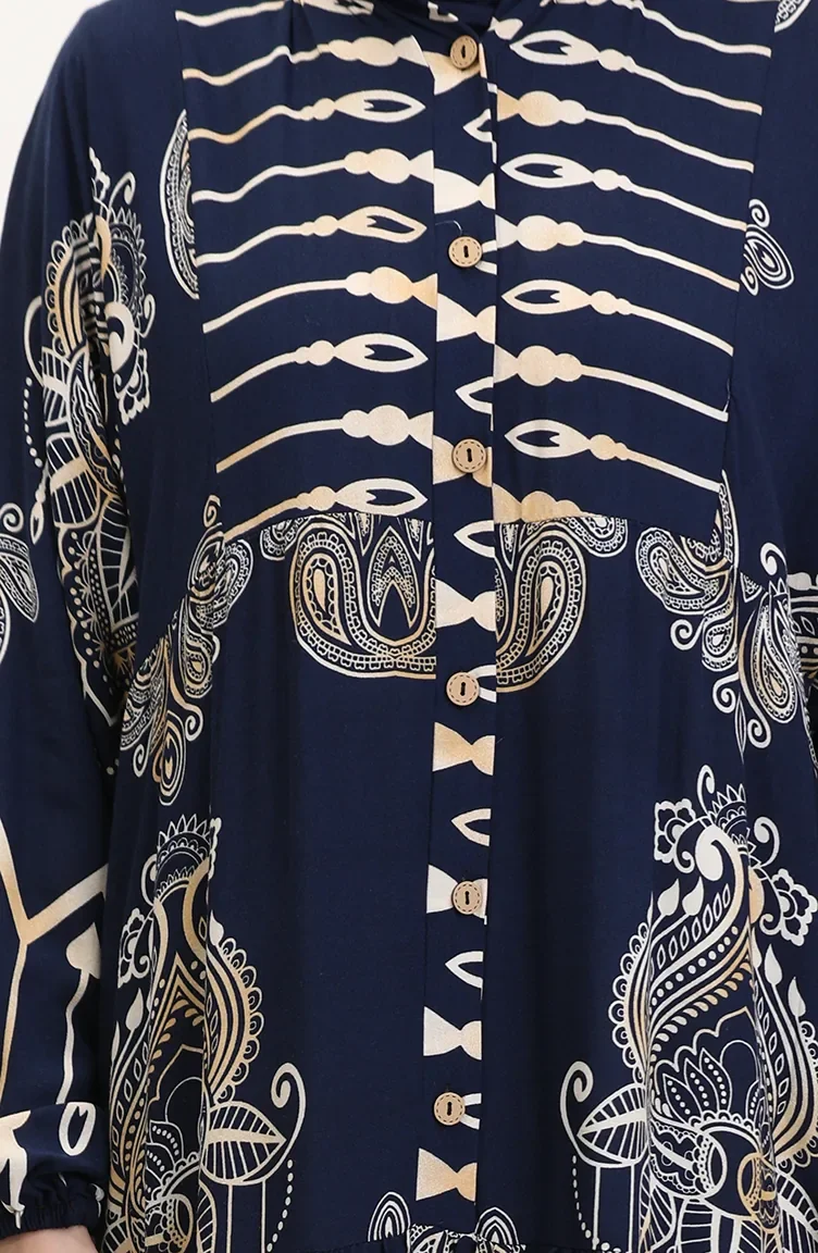 Viskon kumaş Desenli Düğmeli Elbise 2014-03 Lacivert