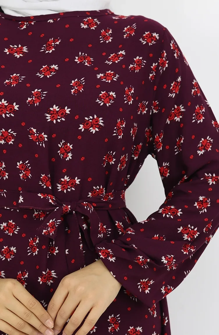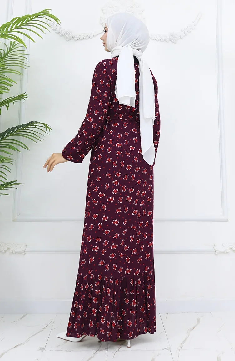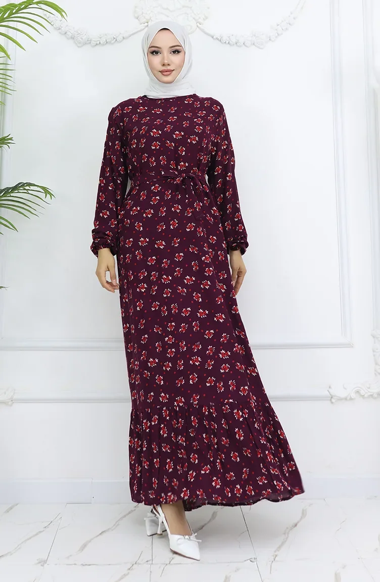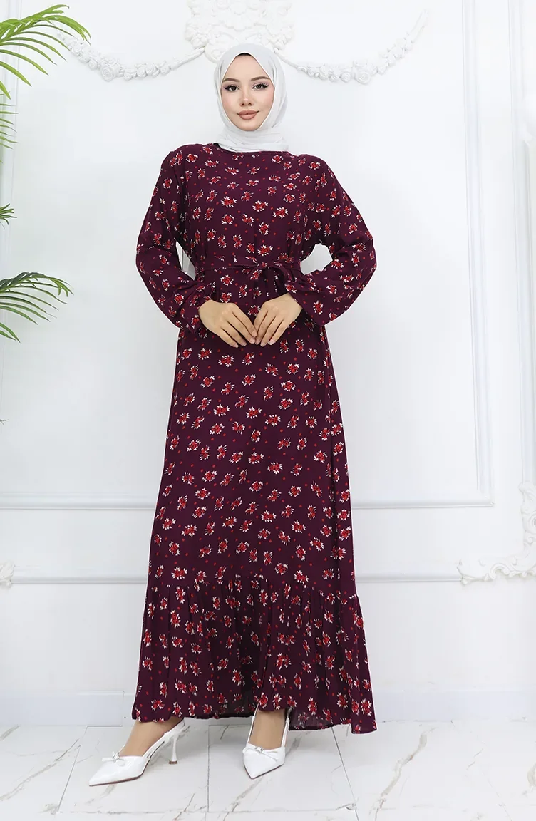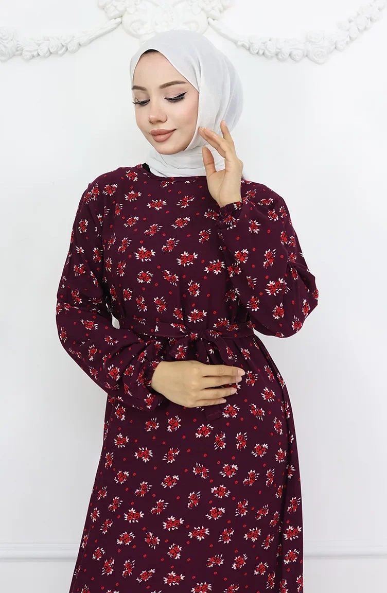 Viskon Kumaş Desenli Elbise 0035-03 Mürdüm