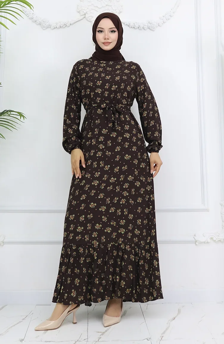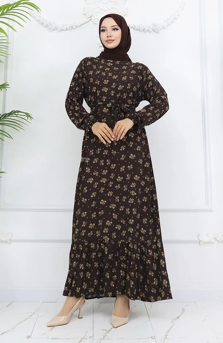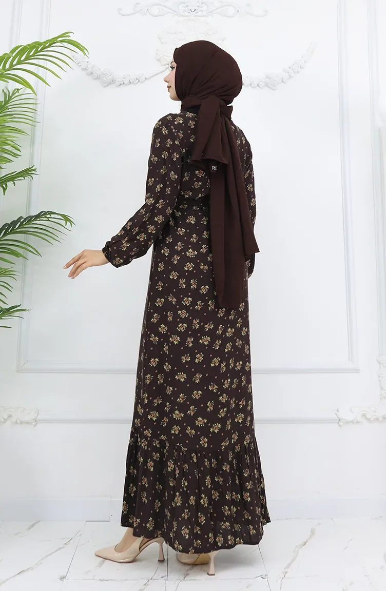 Viskon Kumaş Desenli Elbise 0035-05 Kahverengi