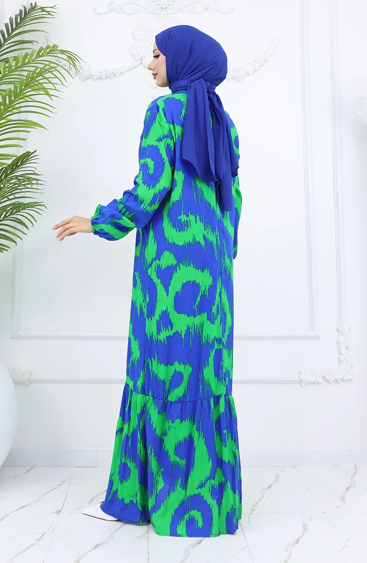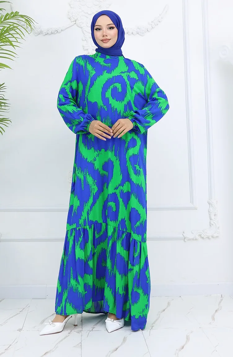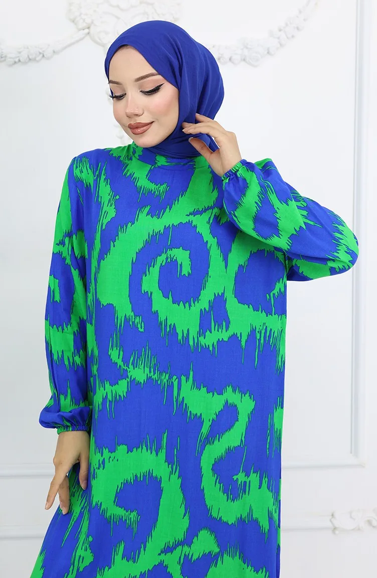 Viskon Kumaş Desenli Elbise 2019-01 Saks Yeşil