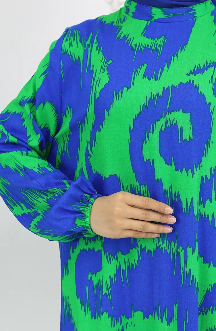 Saks renktedir. Viskon kumaş. Desenli kumaş. Fermuarlı. Lastik kollu. Sıfır yaka detayı ile rahat kullanıma sahiptir. 4 Mevsim tercih edebilirsiniz. Rahat. Büyük beden seçeneği mevcuttur.