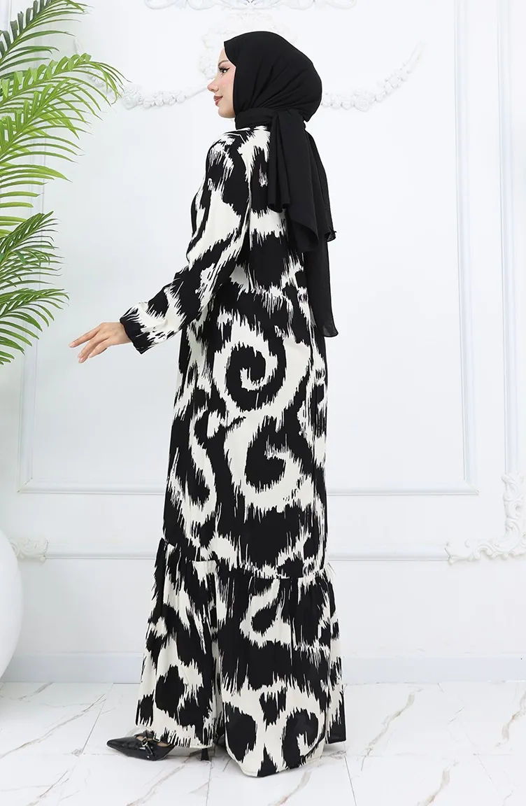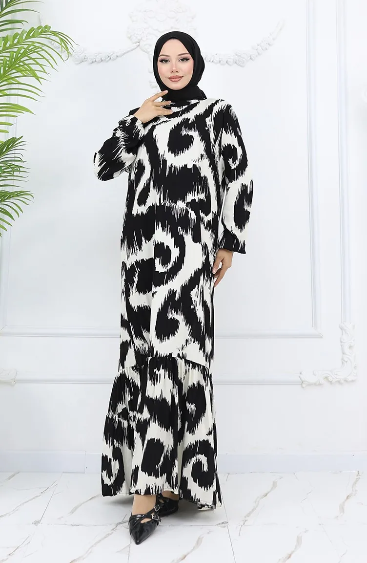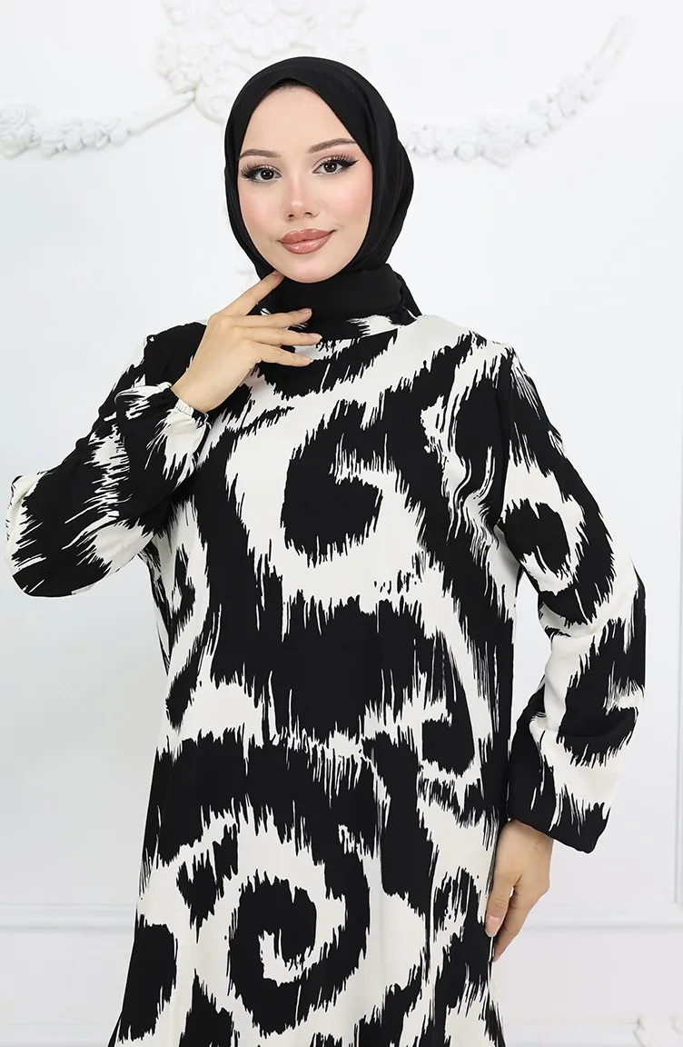 Viskon Kumaş Desenli Elbise 2019-03 Siyah Beyaz