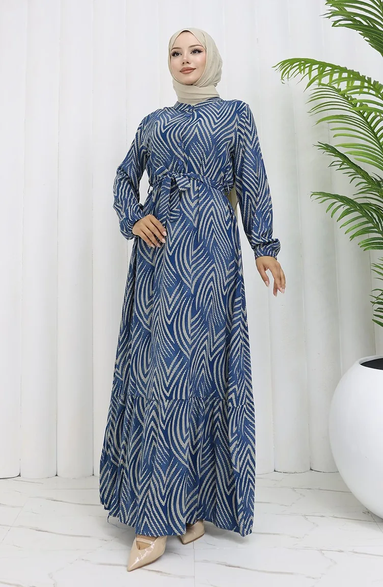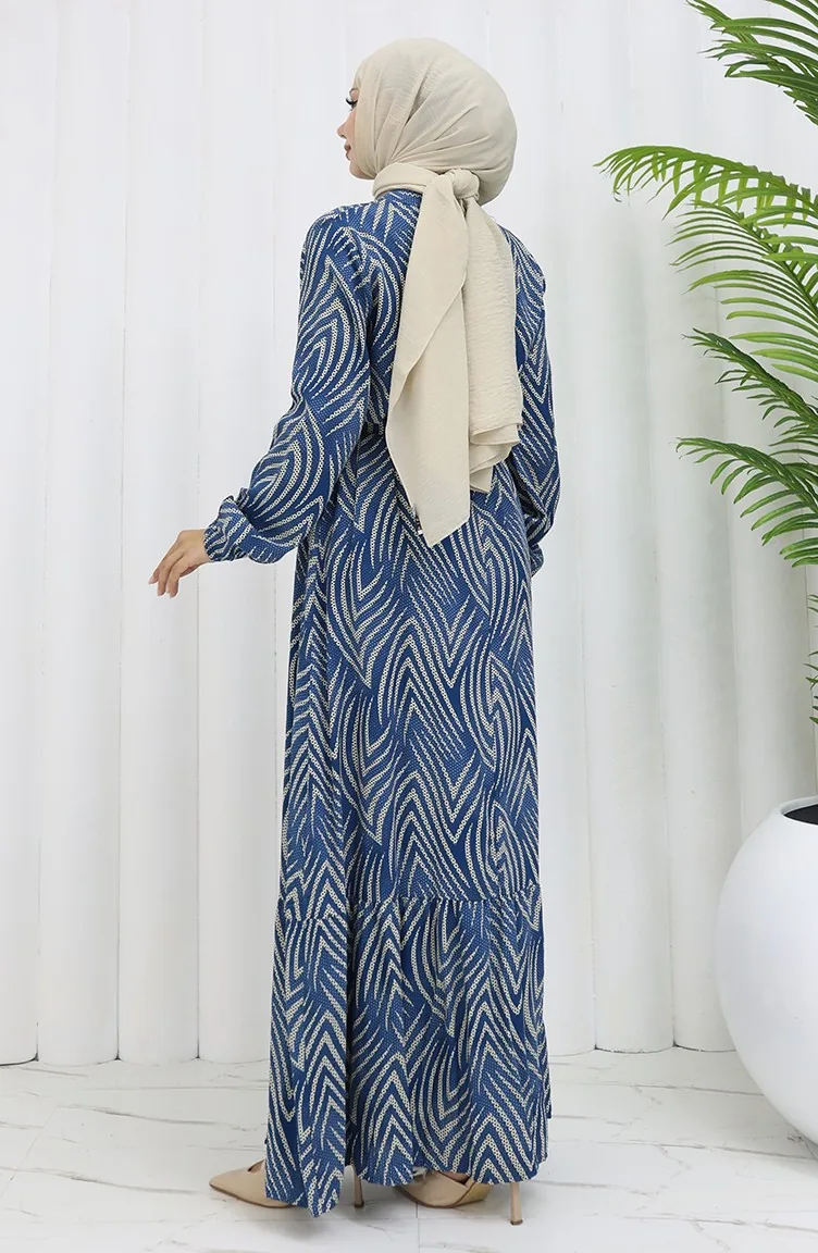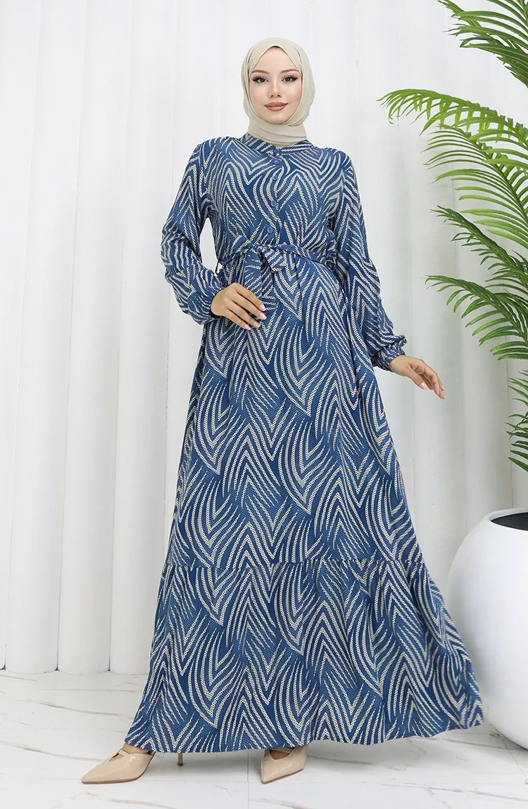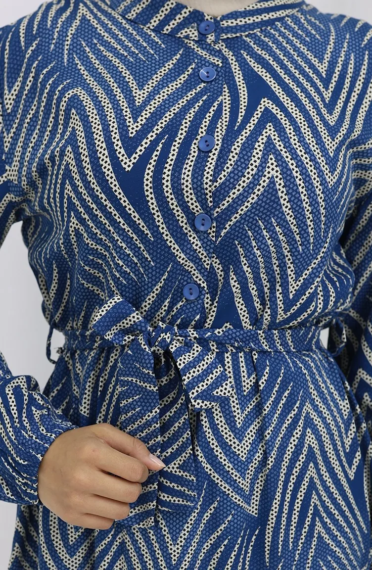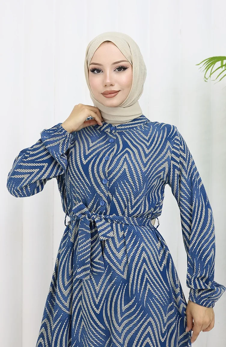 Viskon Kumaş Desenli Elbise 4074-05 İndigo
