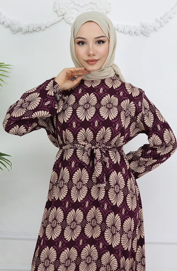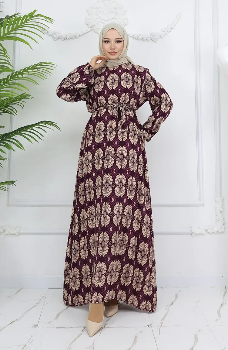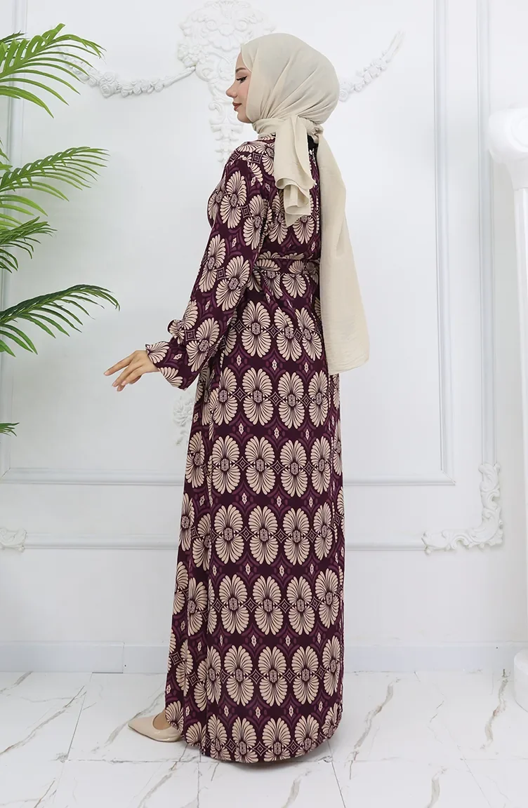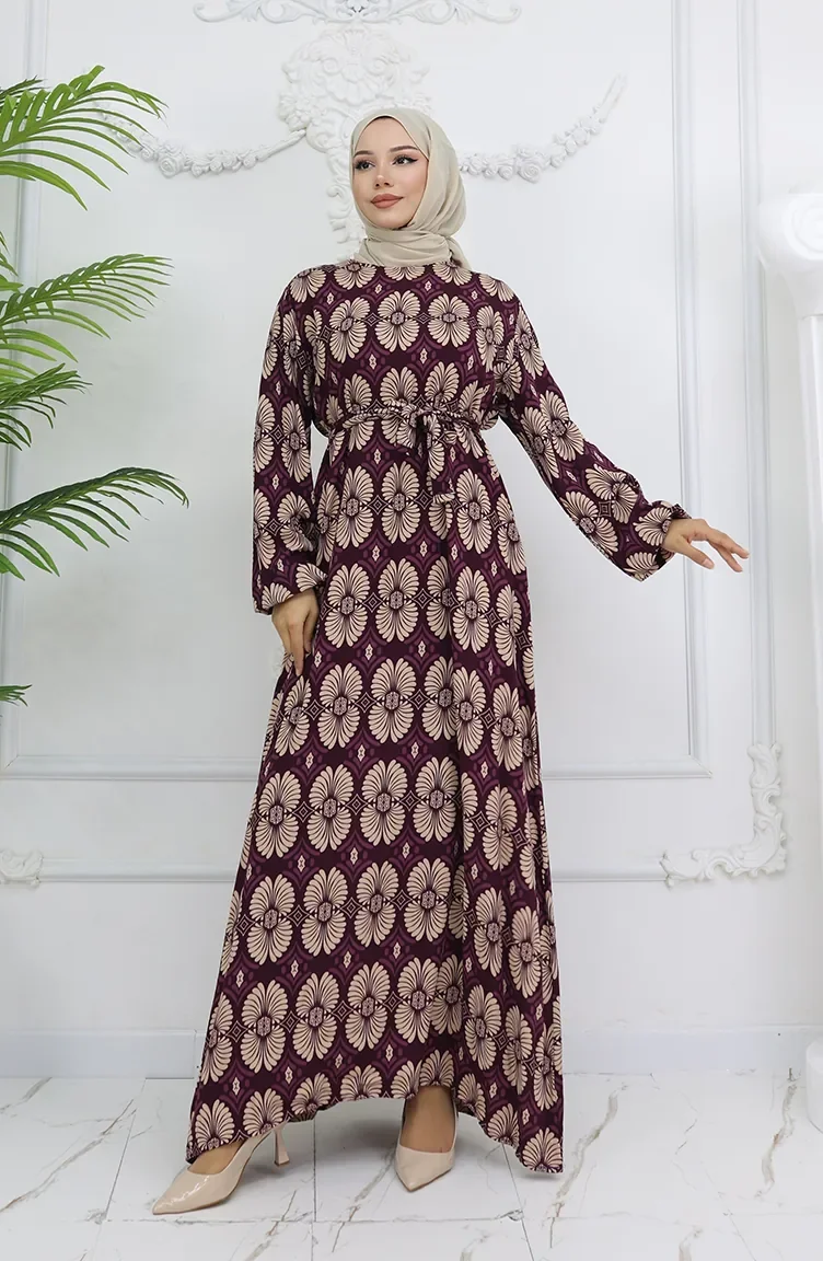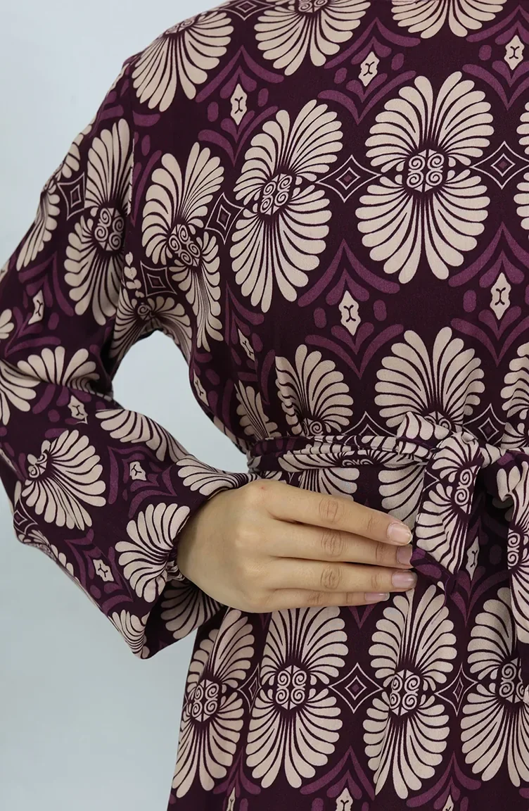 Viskon Kumaş Desenli Kuşaklı Elbise 2008-01 Mor