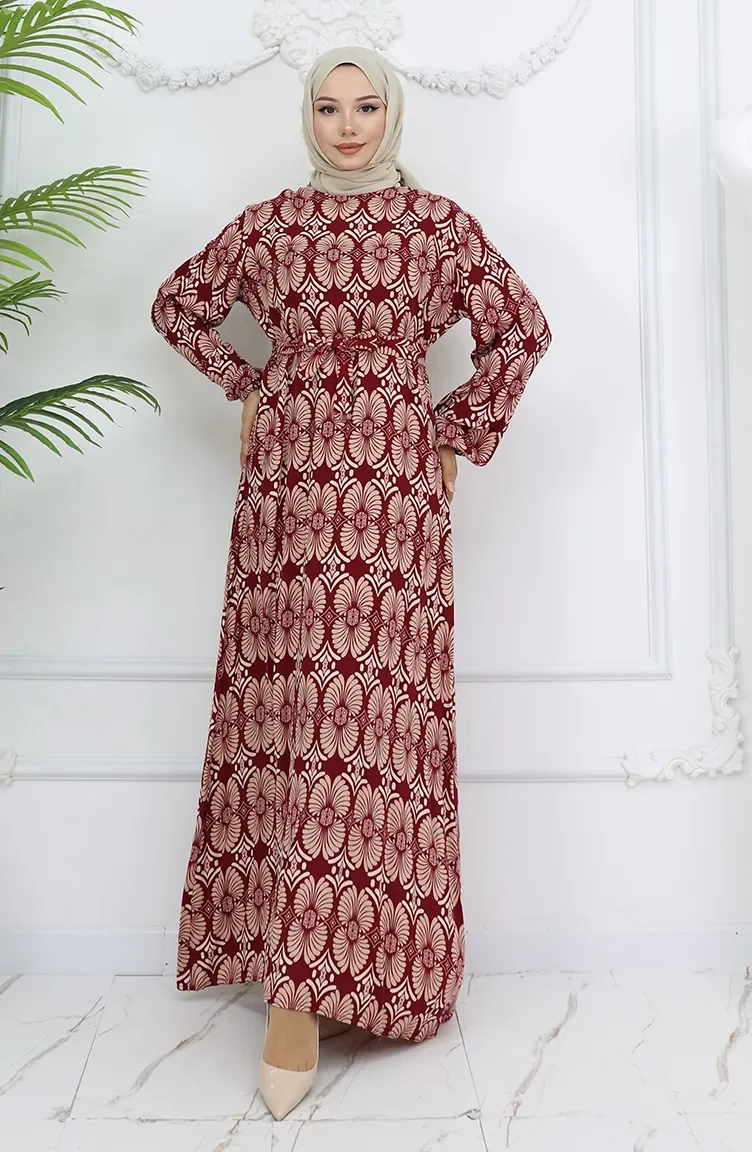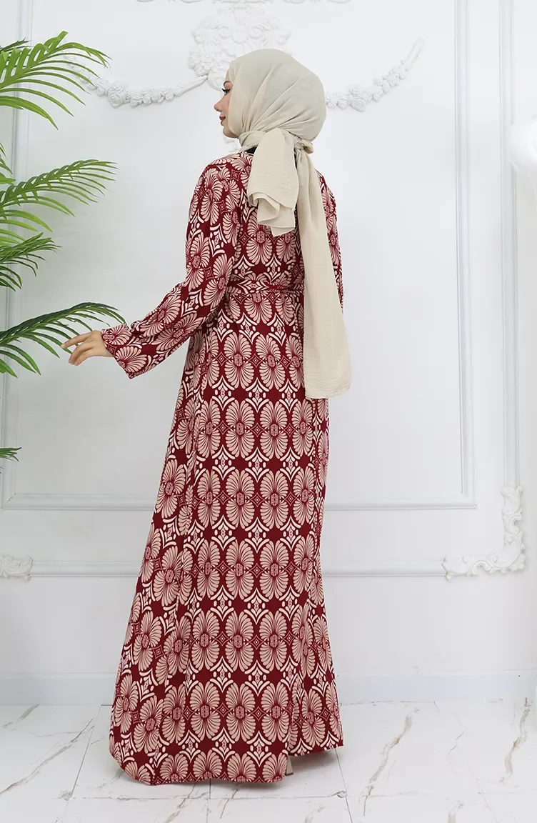Viskon Kumaş Desenli Kuşaklı Elbise 2008-02 Bordo