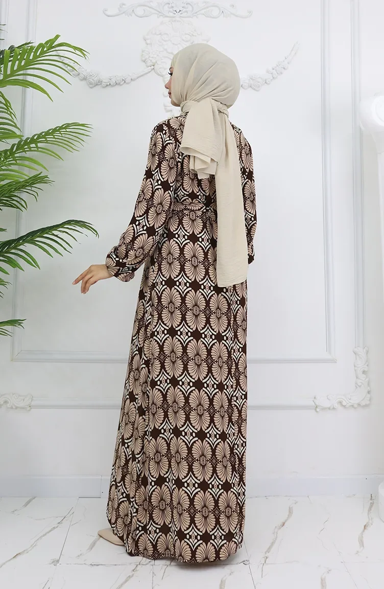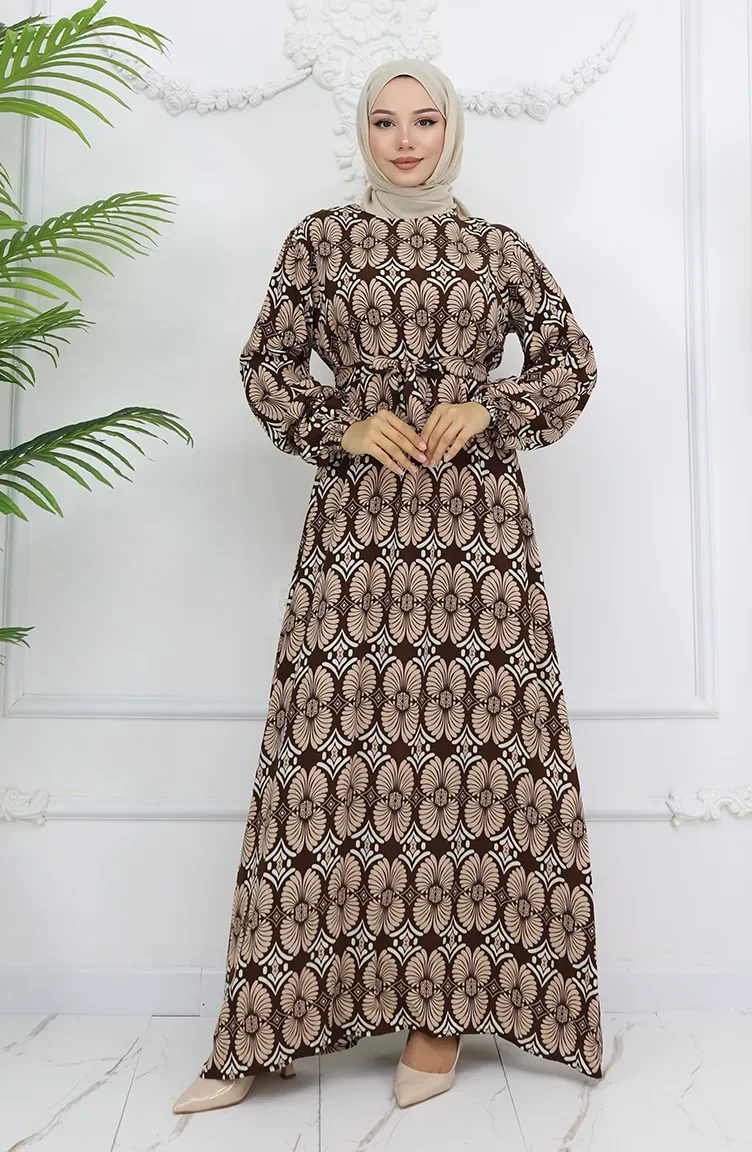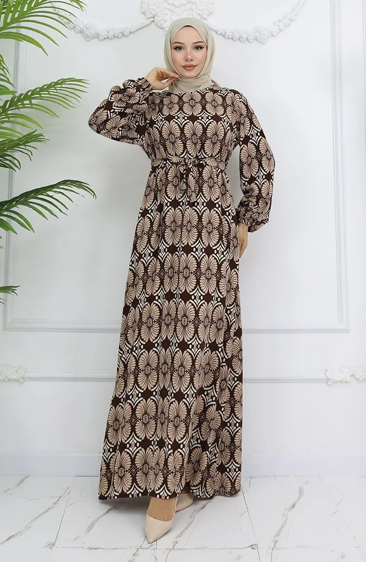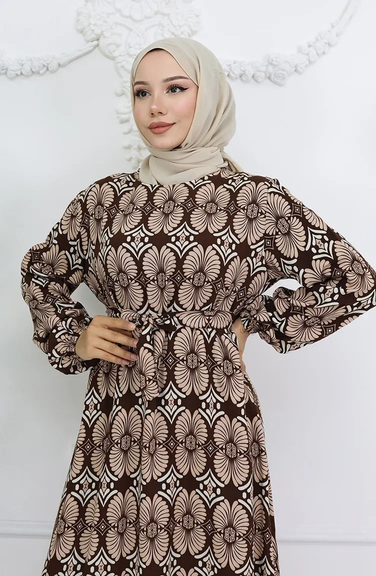 Viskon Kumaş Desenli Kuşaklı Elbise 2008-03 Kahverengi