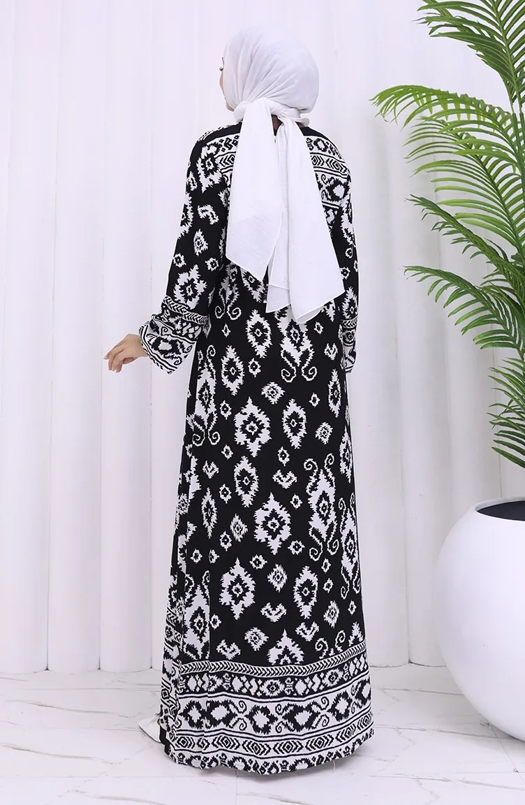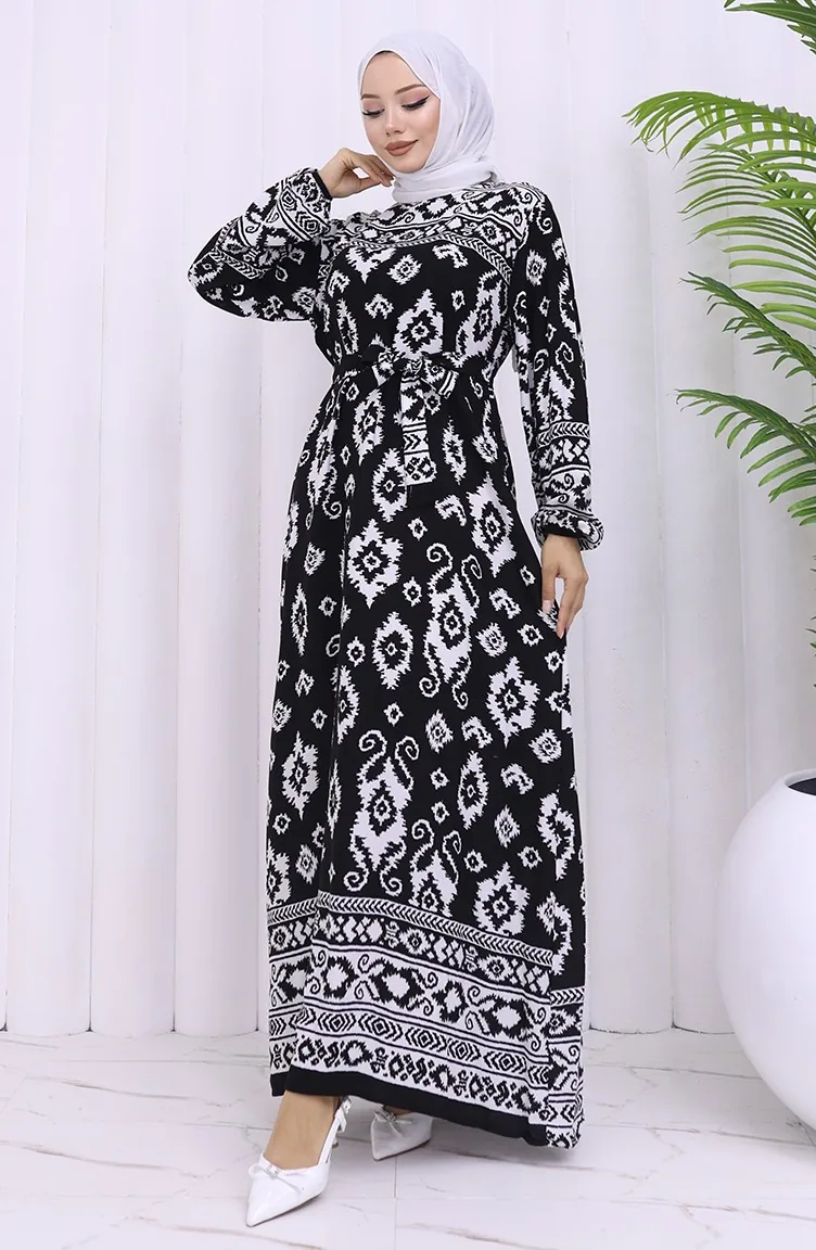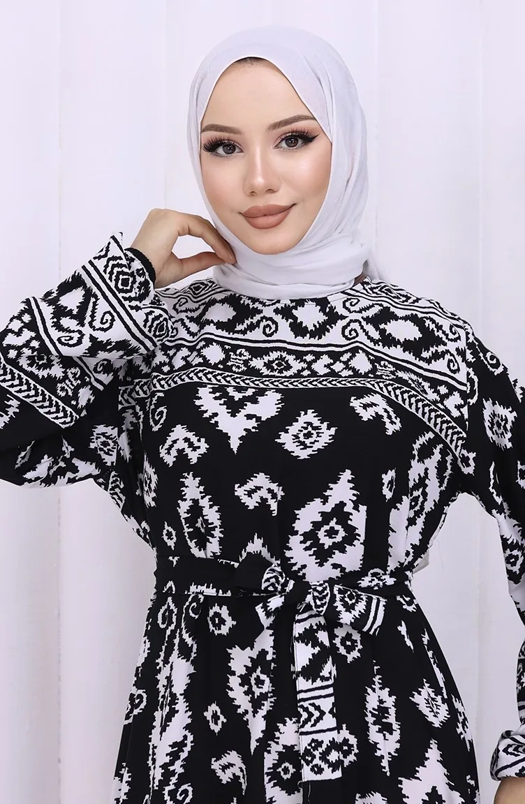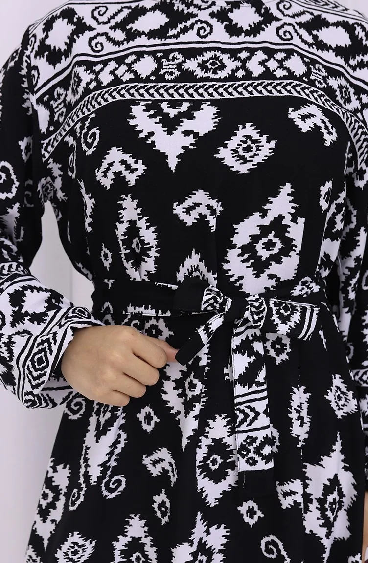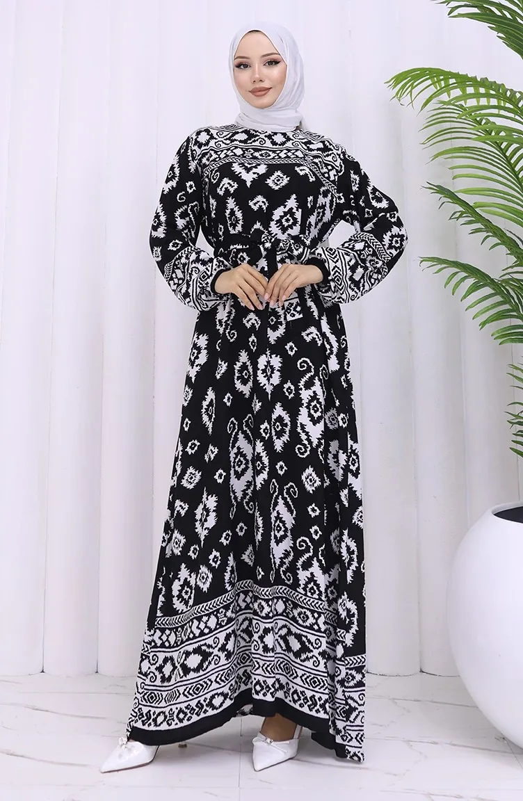 Viskon Kumaş Desenli Kuşaklı Elbise 2031-04 Siyah