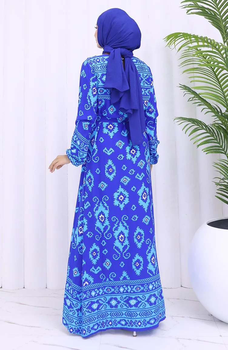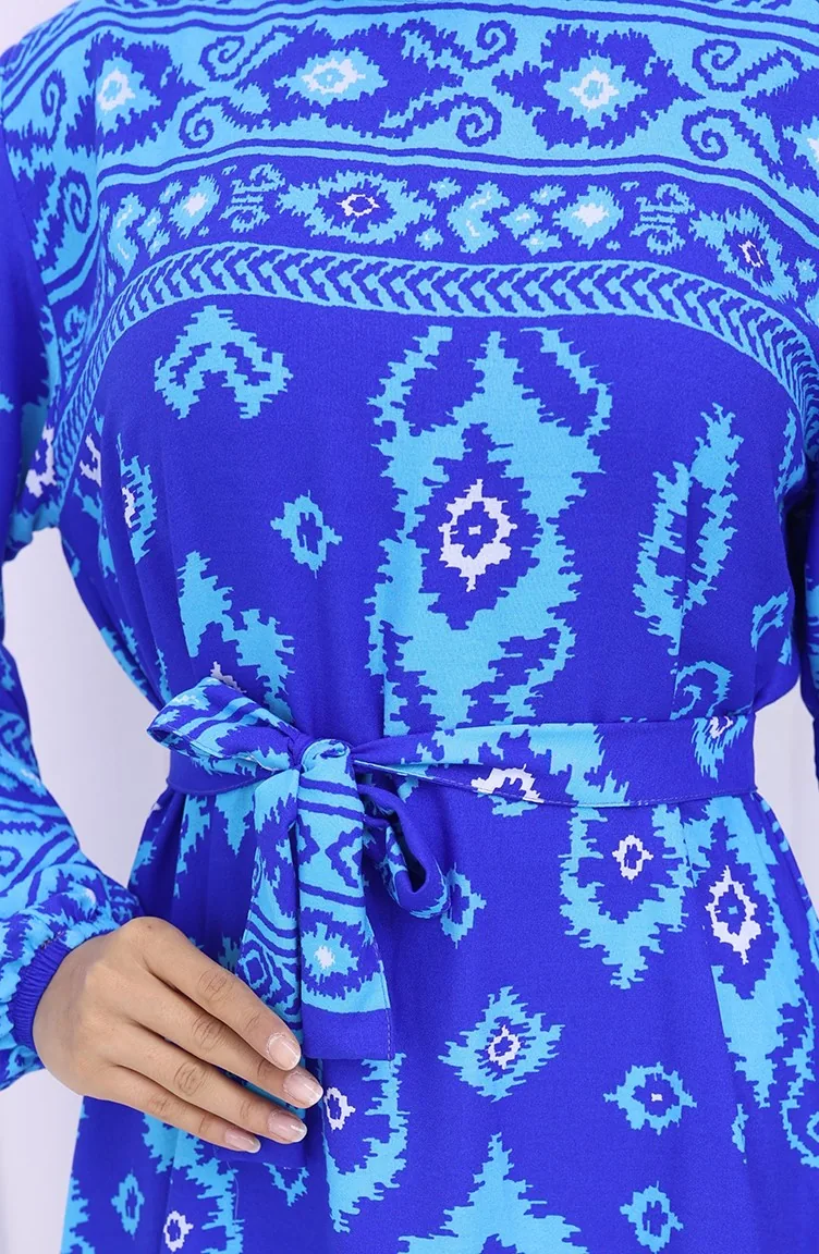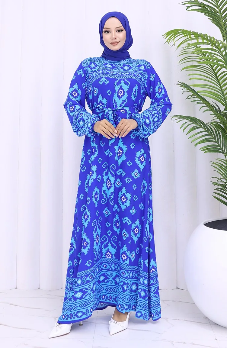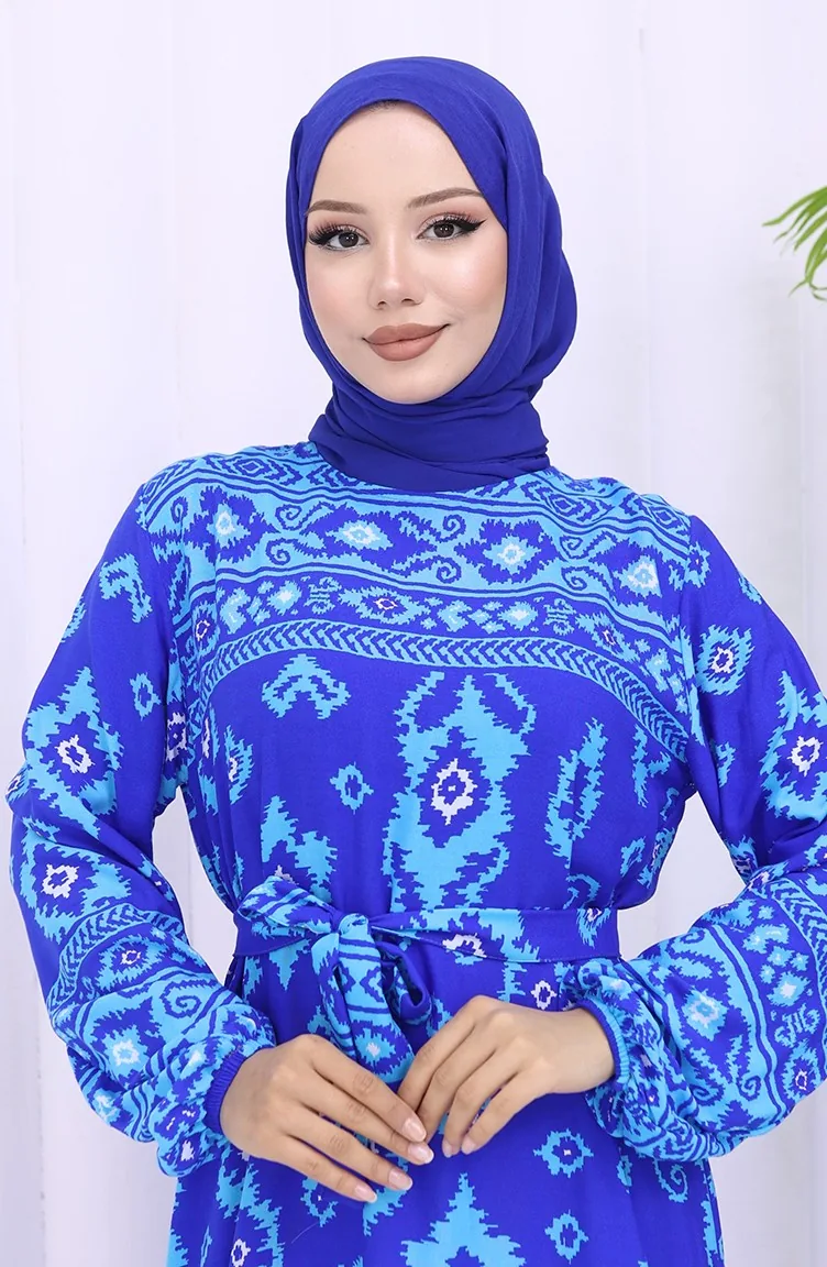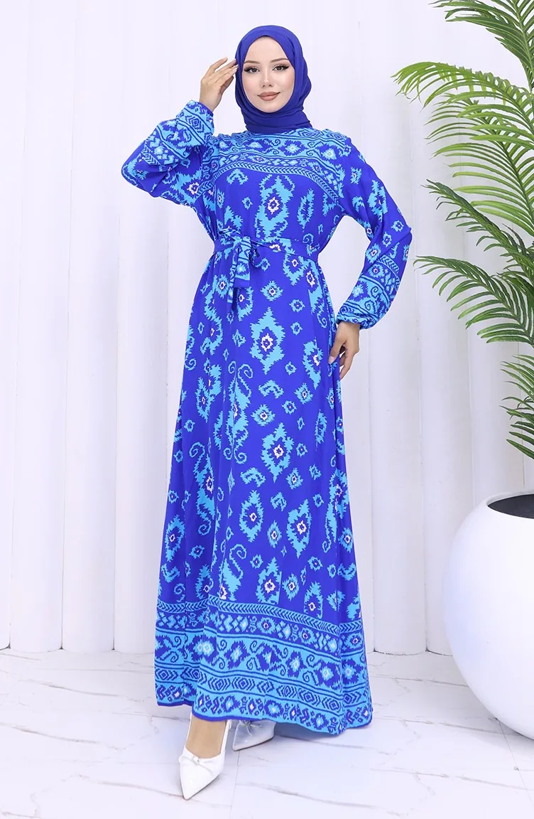 Viskon Kumaş Desenli Kuşaklı Elbise 2031-05 Saks