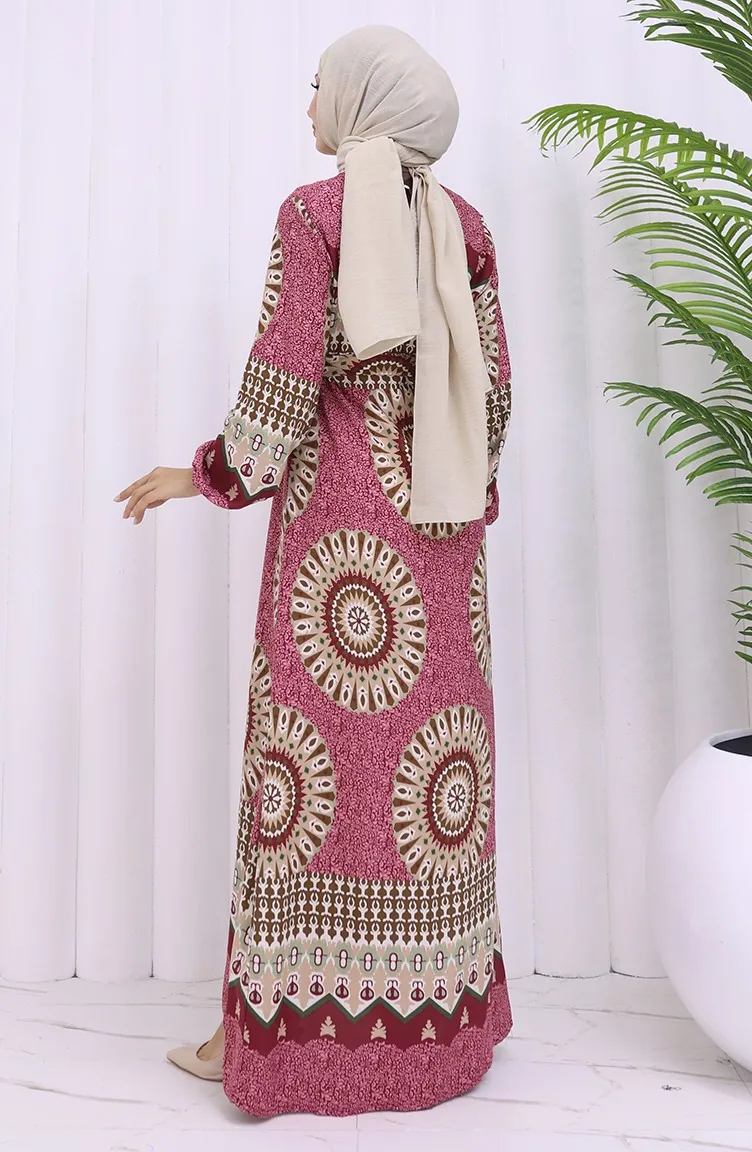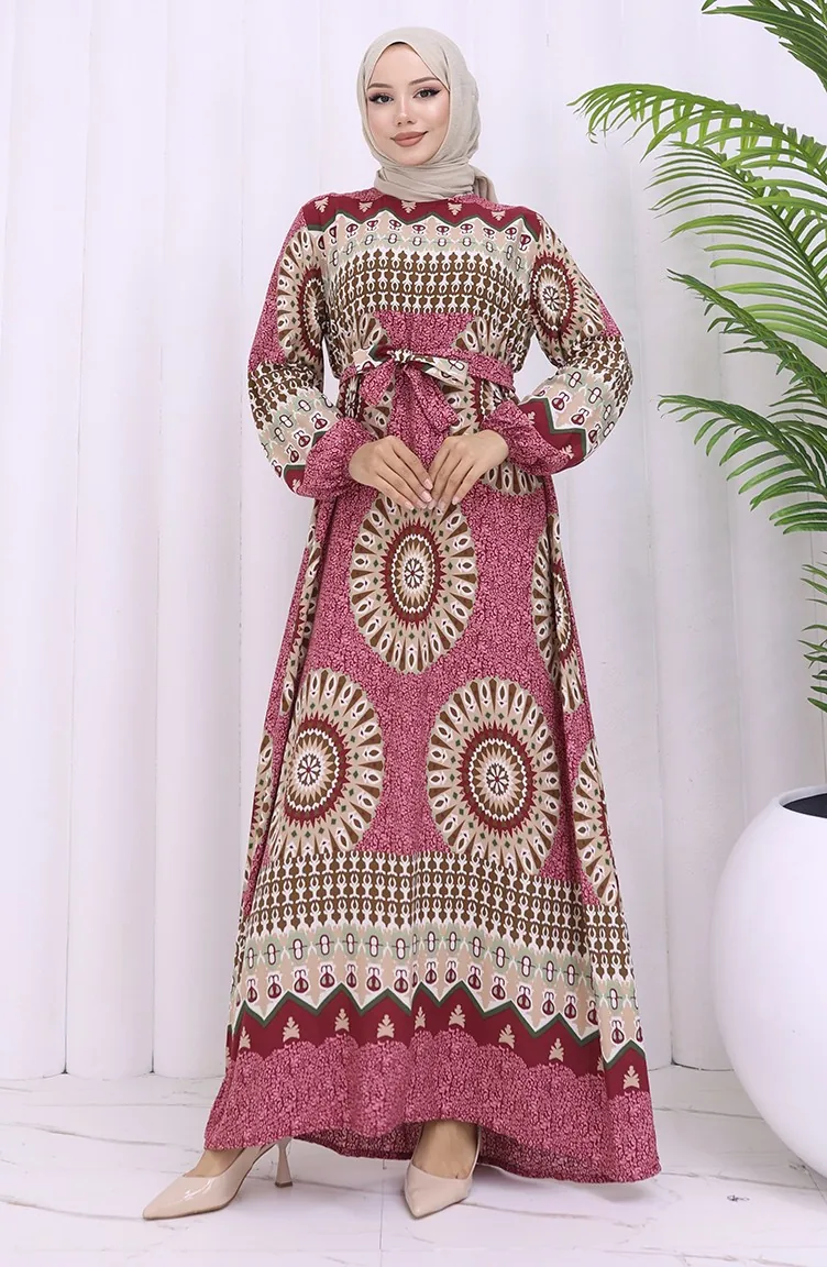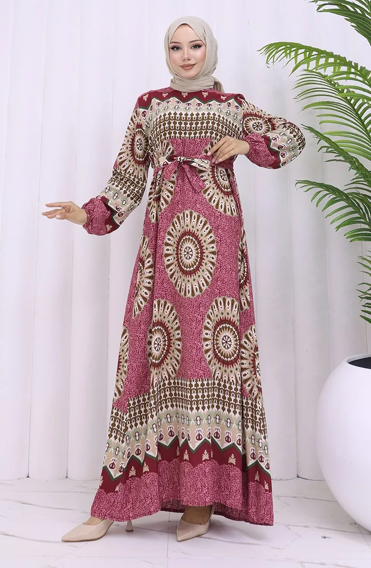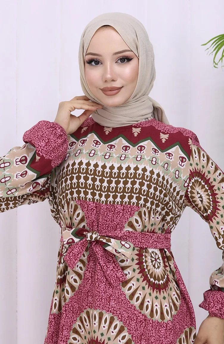 Viskon Kumaş Desenli Kuşaklı Elbise 2032-03 Gül Kurusu Kahverengi