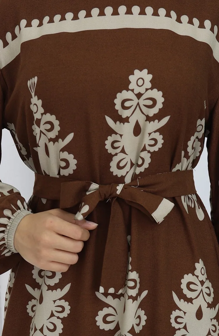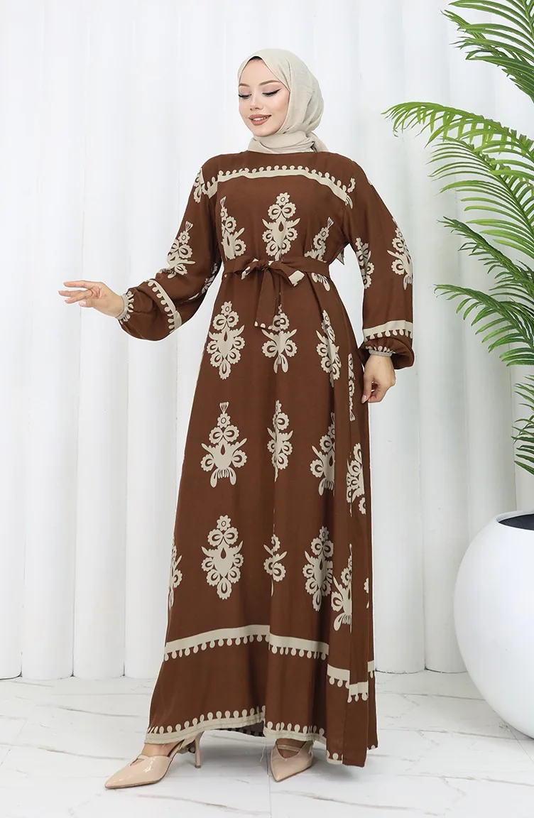Viskon Kumaş Desenli Kuşaklı Elbise 2039-03 Kahverengi Bej