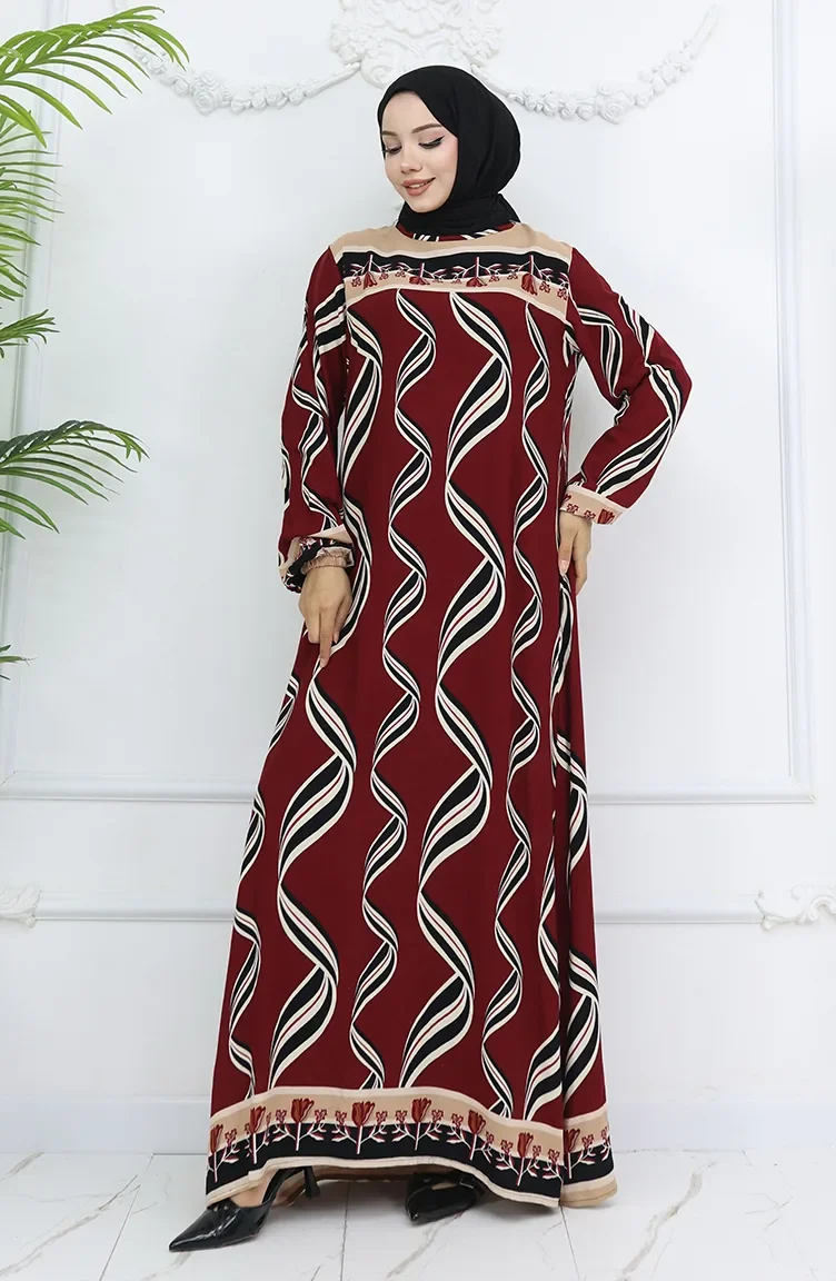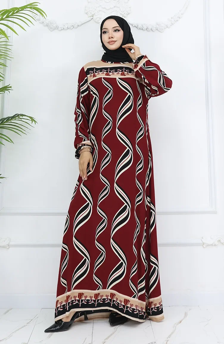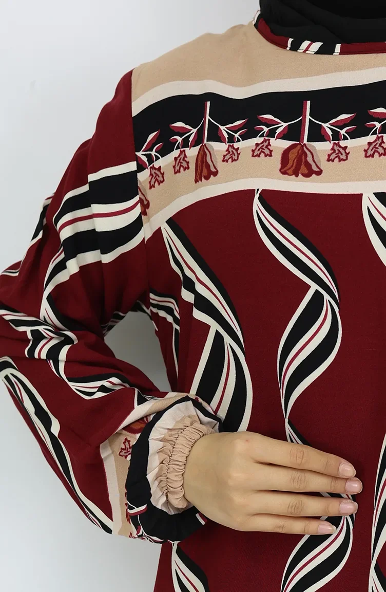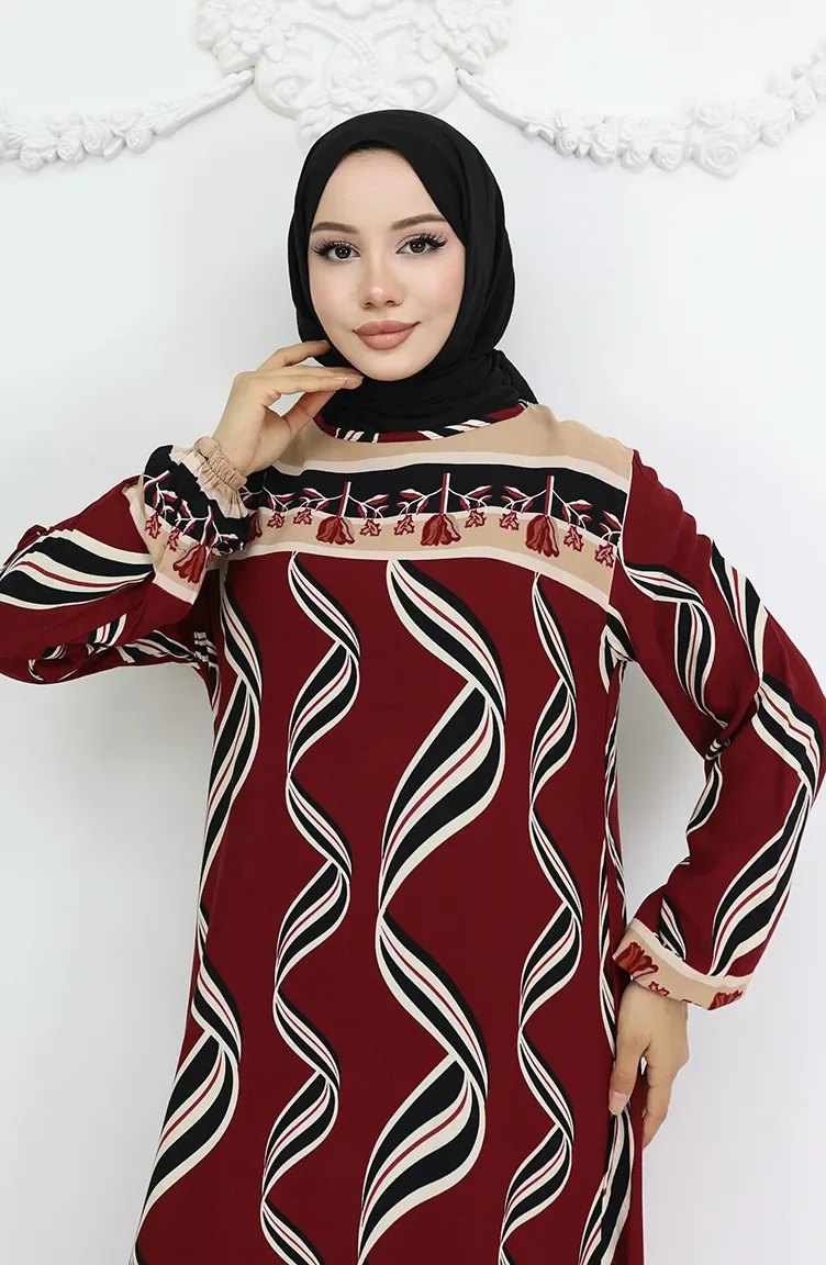 Viskon Kumaş Kol Ucu Lastikli Elbise 0031-03 Bordo
