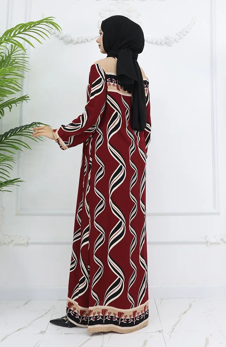 Bordo renktedir. Viskon kumaş. Desenli kumaş. Astarsız. Lastik kollu. Sıfır yaka detayı ile rahat kullanıma sahiptir. 4 Mevsim tercih edebilirsiniz. Rahat. Büyük beden seçeneği mevcuttur.