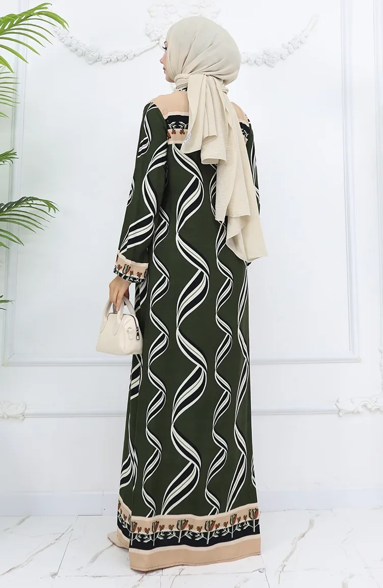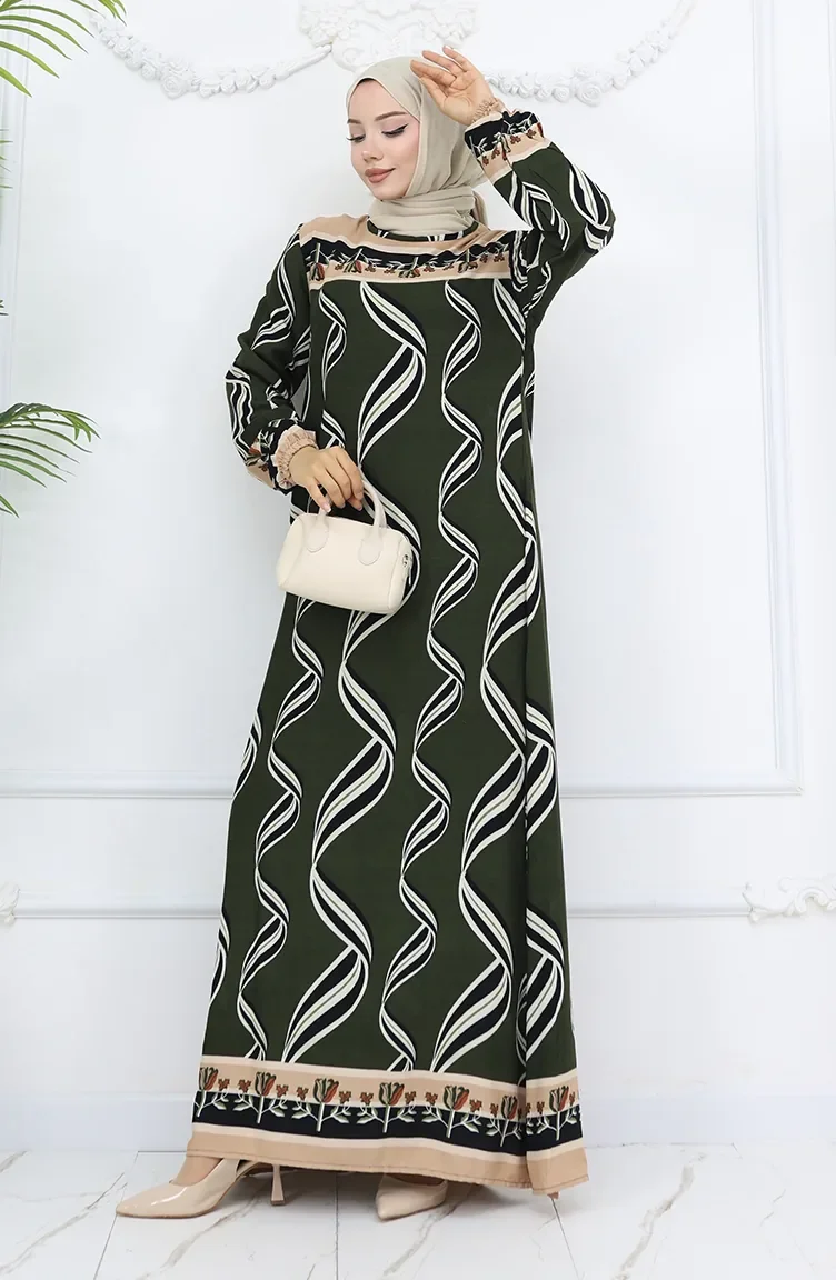 Viskon Kumaş Kol Ucu Lastikli Elbise 0031-06 Haki