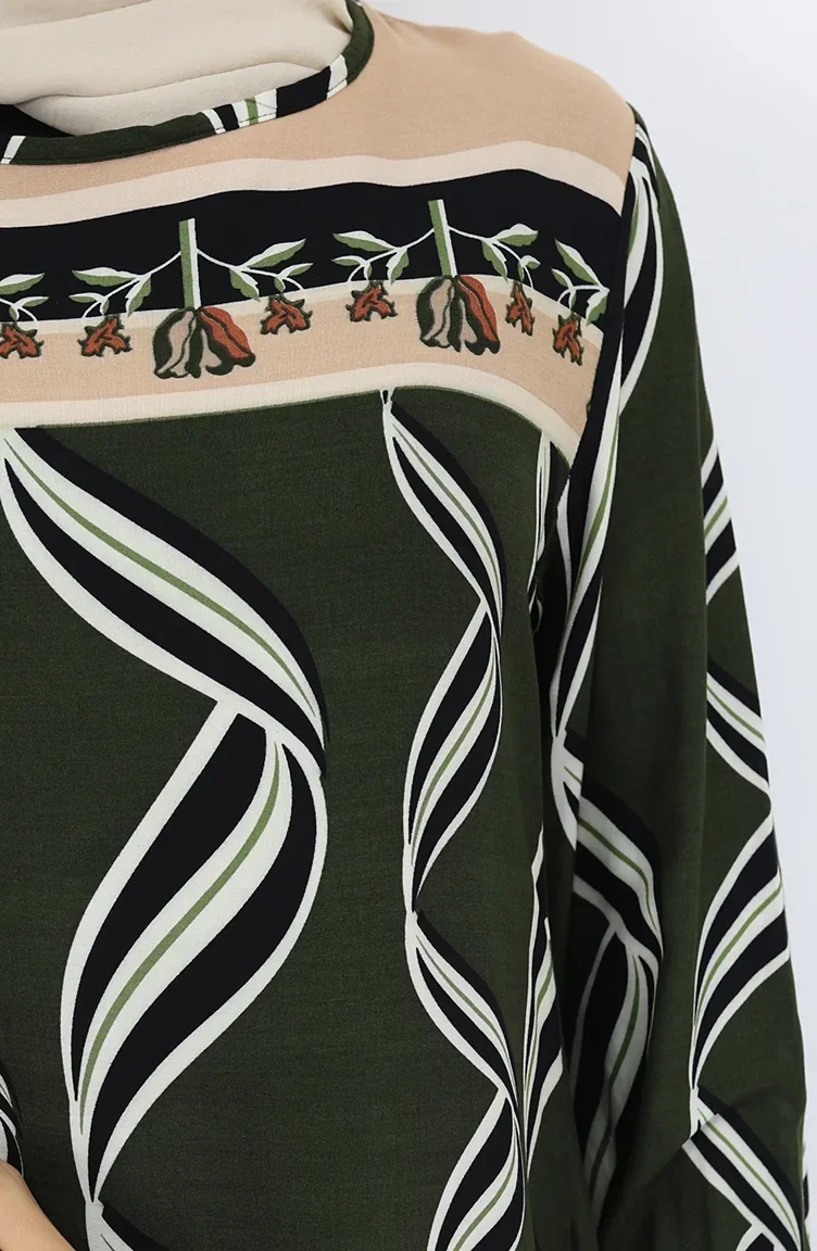 Haki renktedir. Viskon kumaş. Desenli kumaş. Astarsız. Lastik kollu. Sıfır yaka detayı ile rahat kullanıma sahiptir. 4 Mevsim tercih edebilirsiniz. Rahat. Büyük beden seçeneği mevcuttur.
