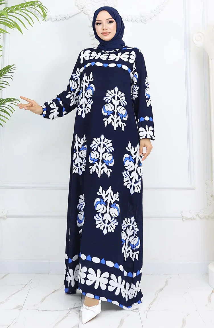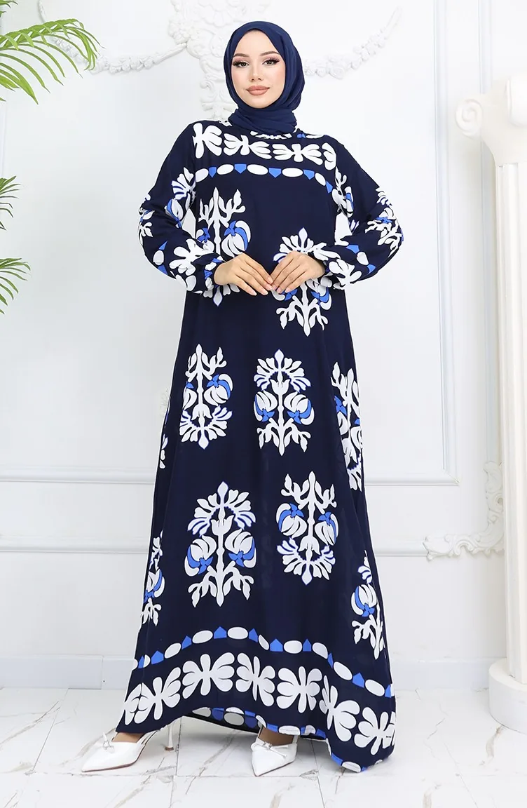Viskon Kumaş Kolu Lastikli Desenli Elbise 0046-04 Lacivert