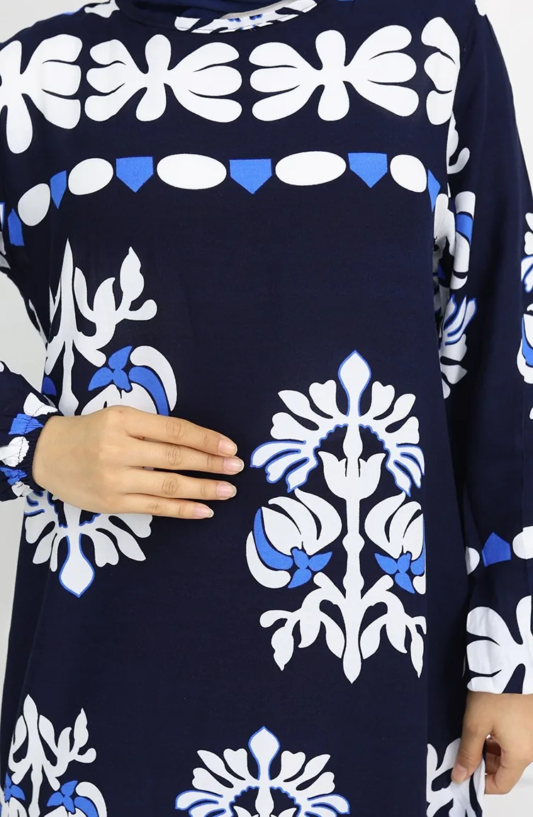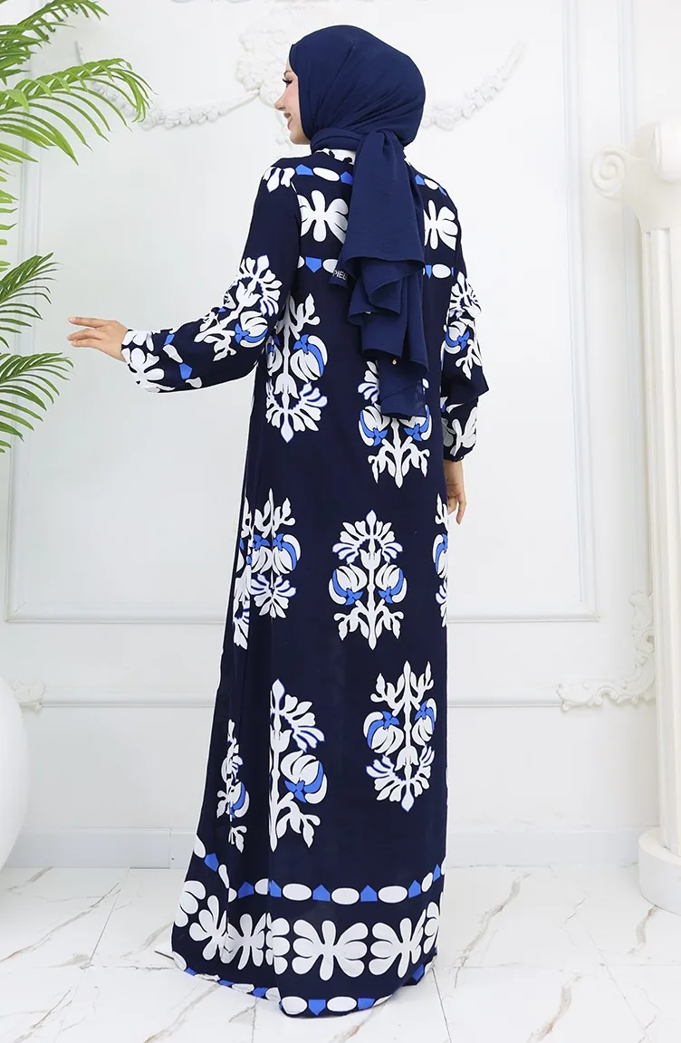 Lacivert renktedir. Viskon kumaş. Desenli kumaş. Lastik kollu. Sıfır yaka detayı ile rahat kullanıma sahiptir. 4 Mevsim tercih edebilirsiniz. Büyük beden seçeneği mevcuttur.