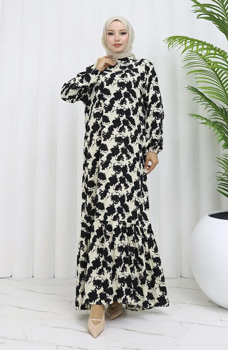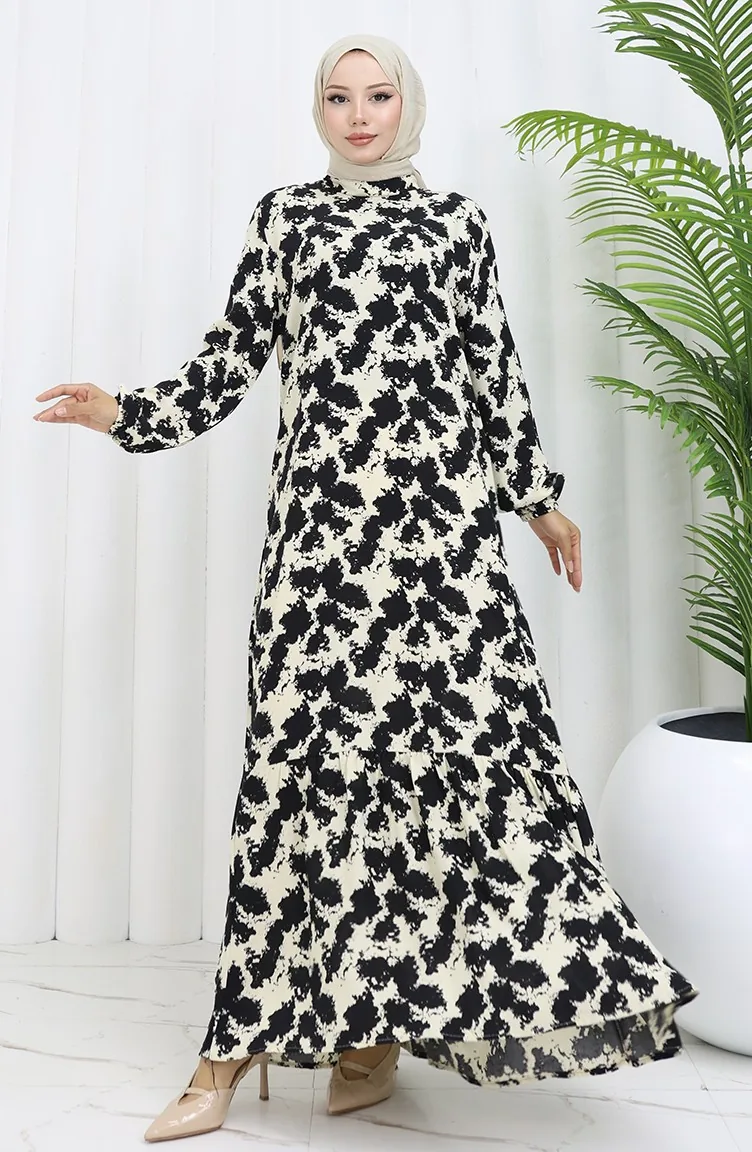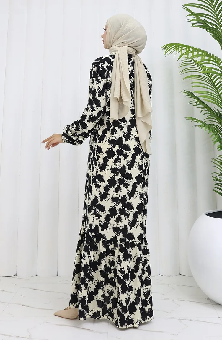 Viskon Kumaş Kolu Lastikli Desenli Elbise 2034-01 Siyah