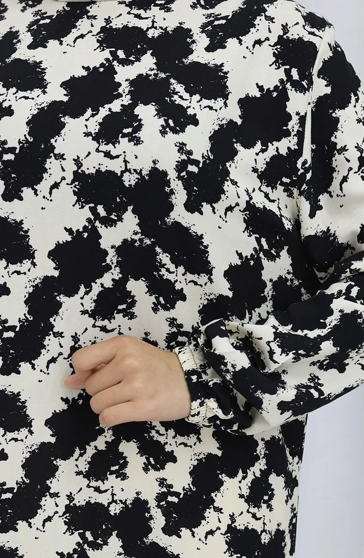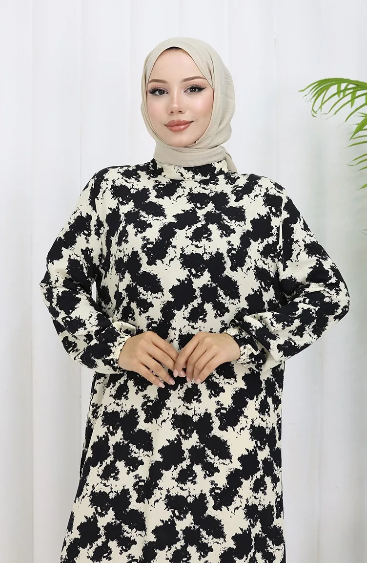 Siyah renktedir. Viskon kumaş. Desenli kumaş. Astarsız. Lastik kollu. Sıfır yaka detayı ile rahat kullanıma sahiptir. 4 Mevsim tercih edebilirsiniz. Rahat. Büyük beden seçeneği mevcuttur.