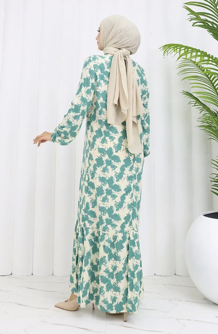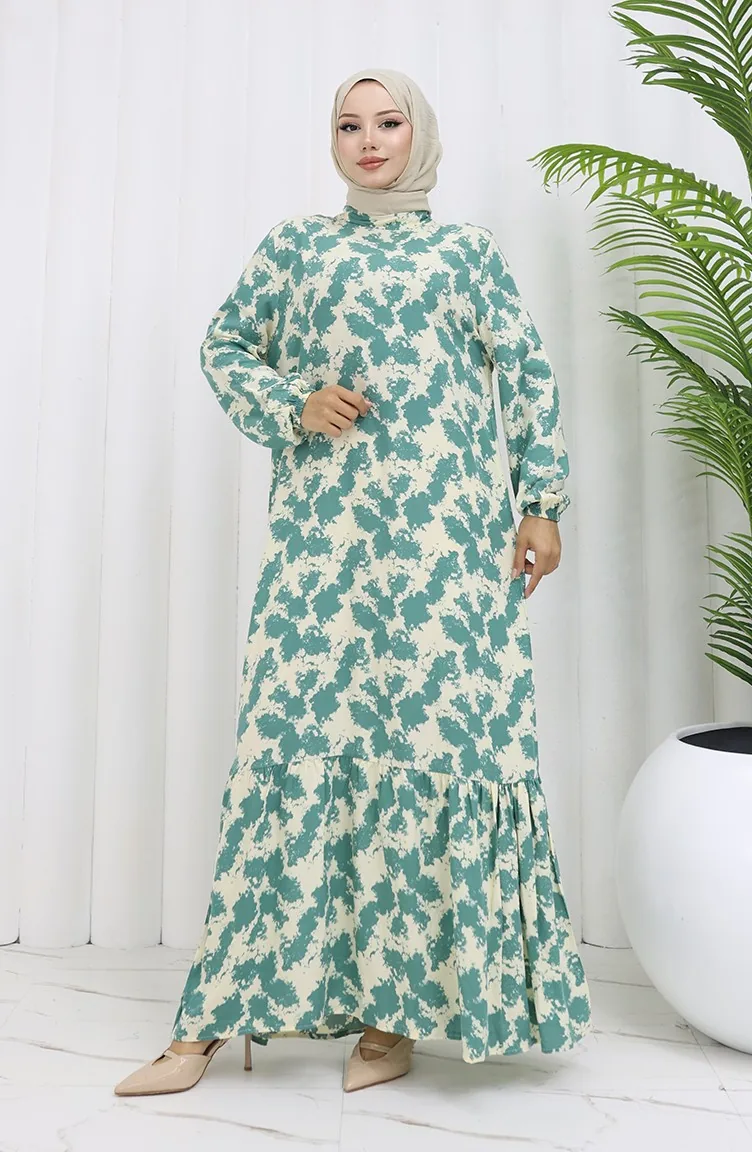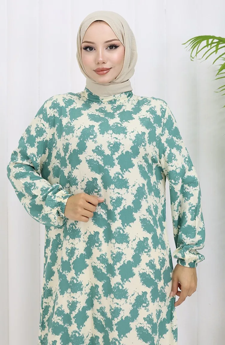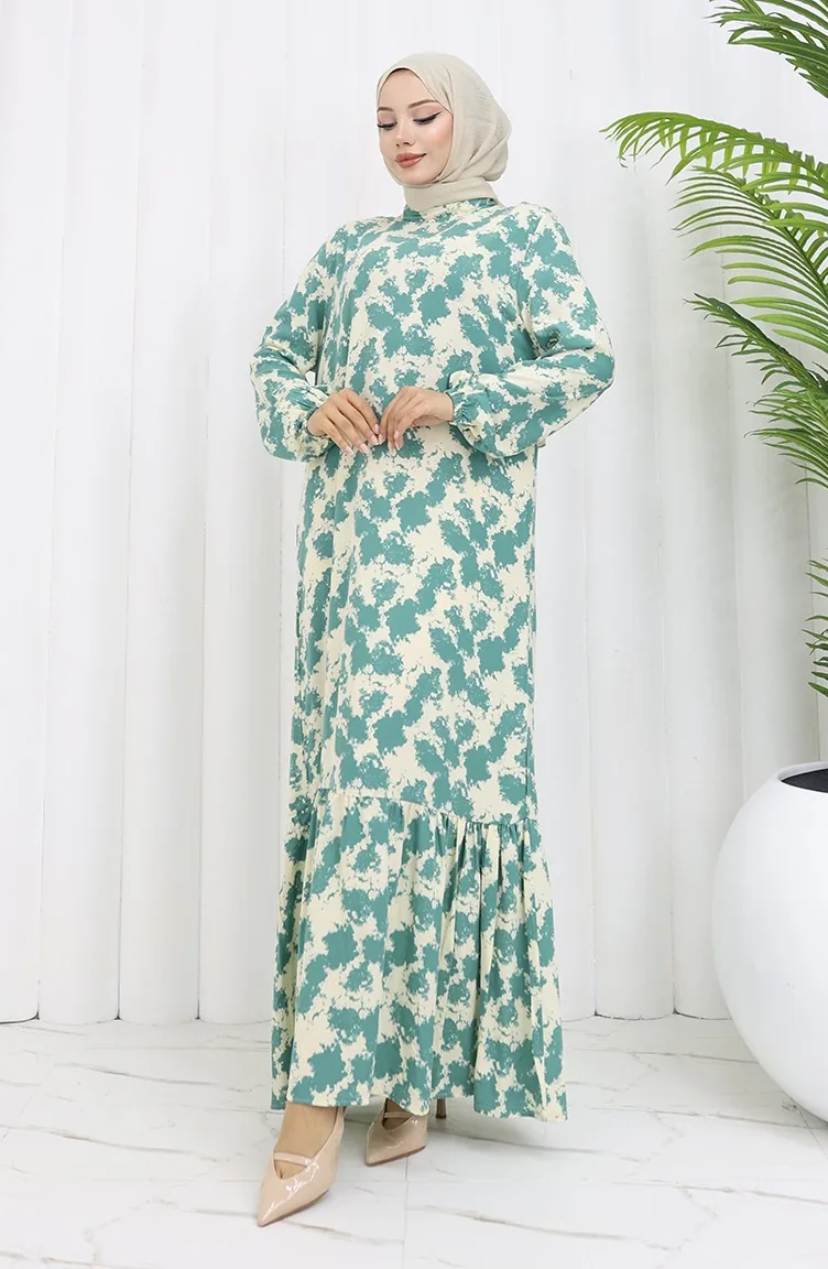 Viskon Kumaş Kolu Lastikli Desenli Elbise 2034-02 Çağla Yeşili