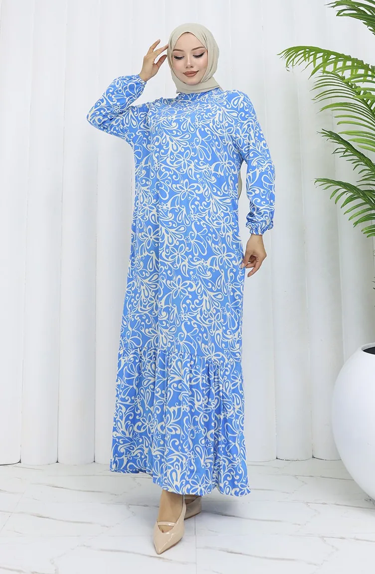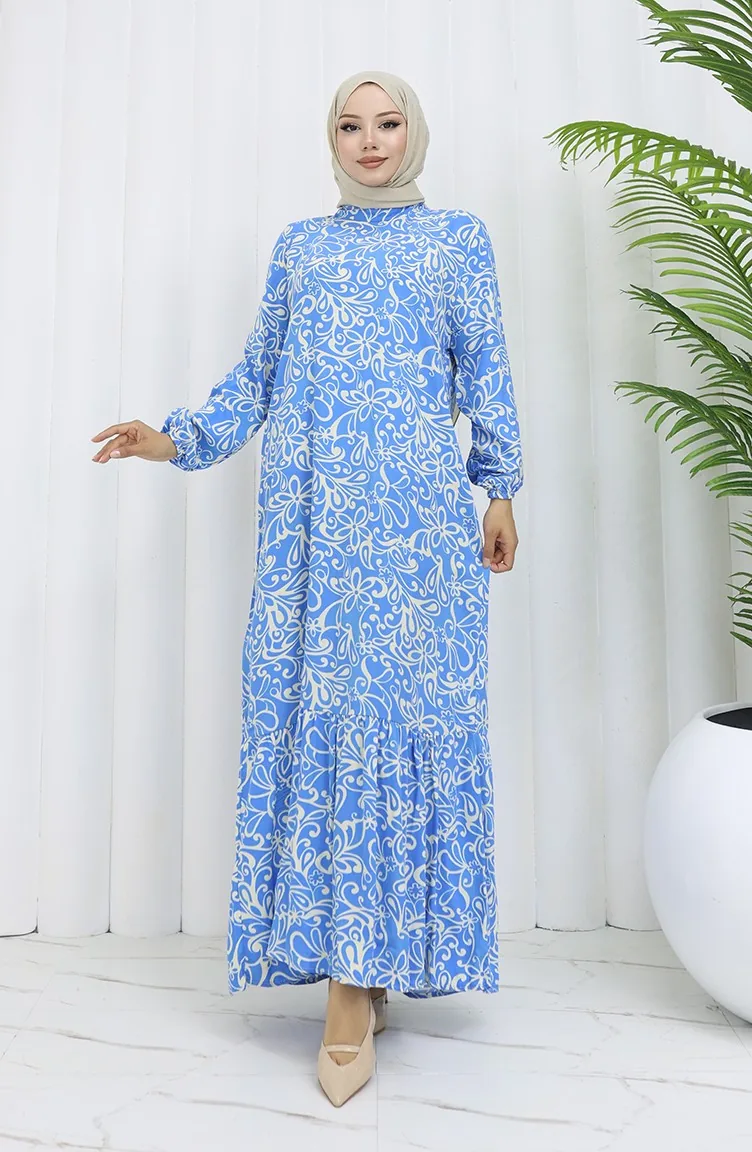Viskon Kumaş Kolu Lastikli Desenli Elbise 2036-01 Mavi