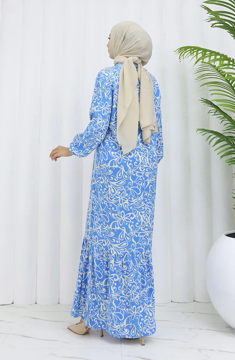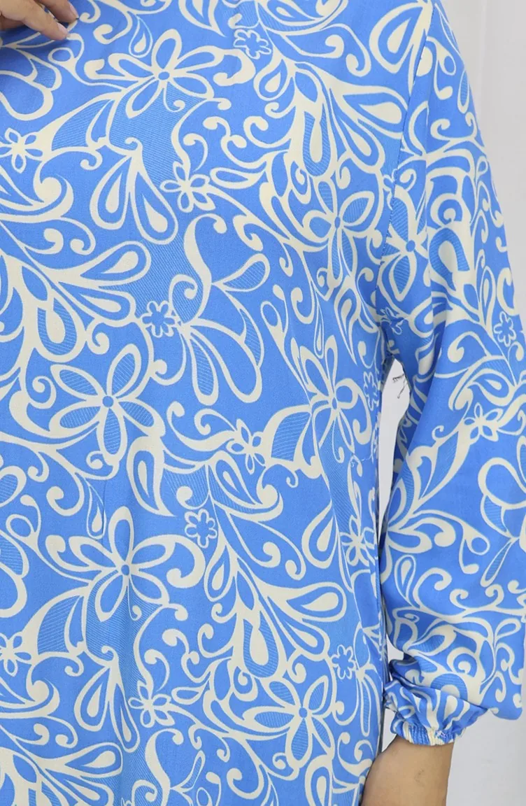 Mavi renktedir. Viskon kumaş. Desenli kumaş. Astarsız. Lastik kollu. Sıfır yaka detayı ile rahat kullanıma sahiptir. 4 Mevsim tercih edebilirsiniz. Rahat. Büyük beden seçeneği mevcuttur.