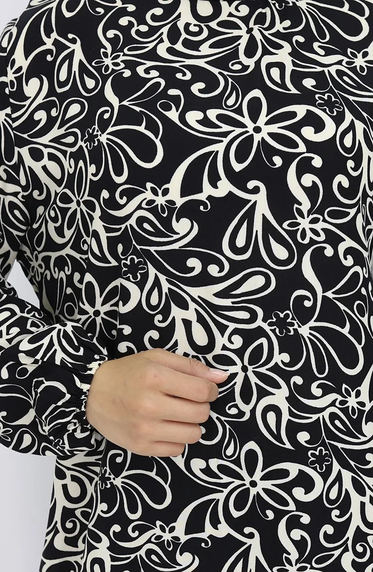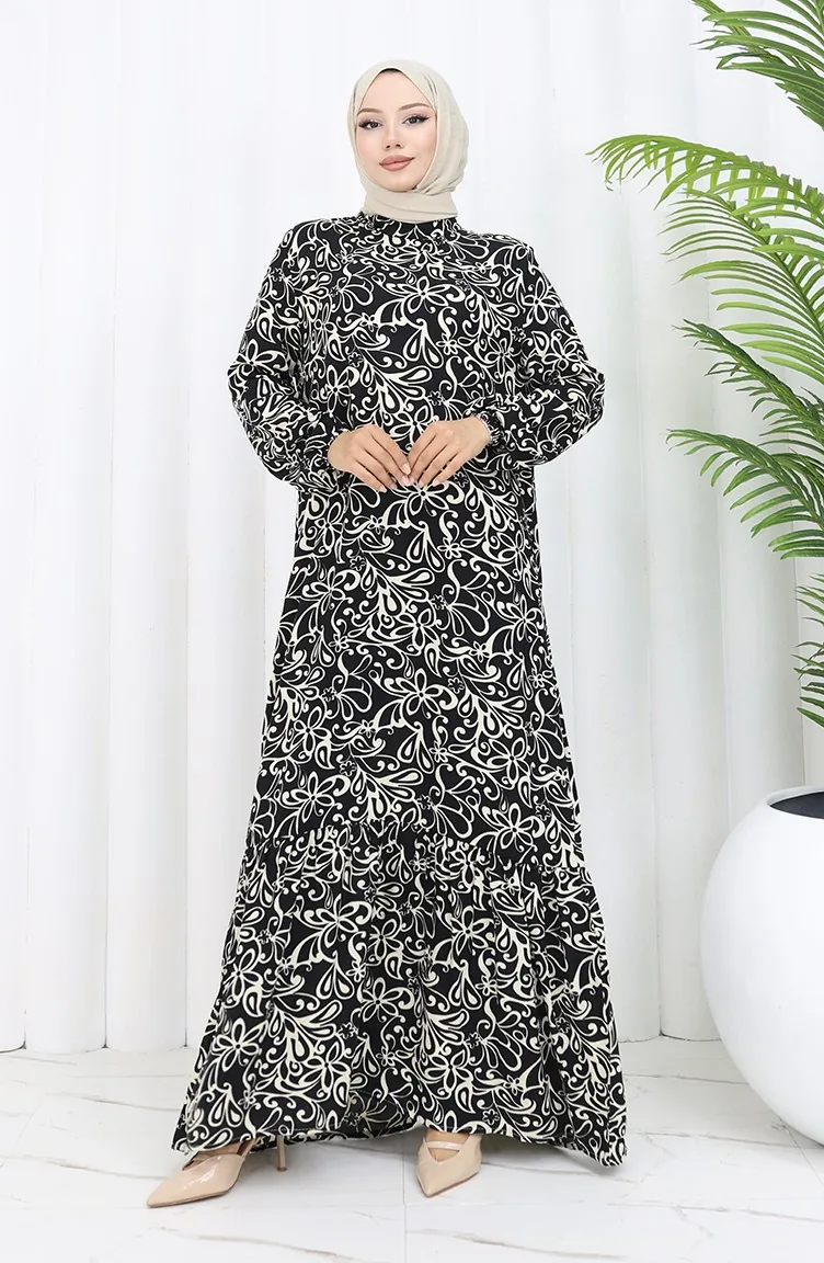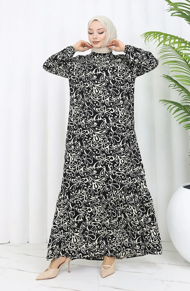 Viskon Kumaş Kolu Lastikli Desenli Elbise 2036-03 Siyah