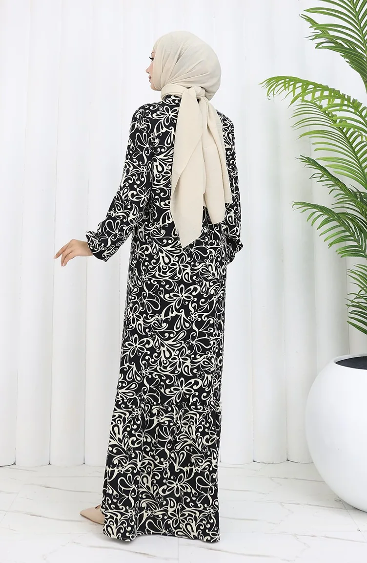 Siyah renktedir. Viskon kumaş. Desenli kumaş. Astarsız. Lastik kollu. Sıfır yaka detayı ile rahat kullanıma sahiptir. 4 Mevsim tercih edebilirsiniz. Rahat. Büyük beden seçeneği mevcuttur.