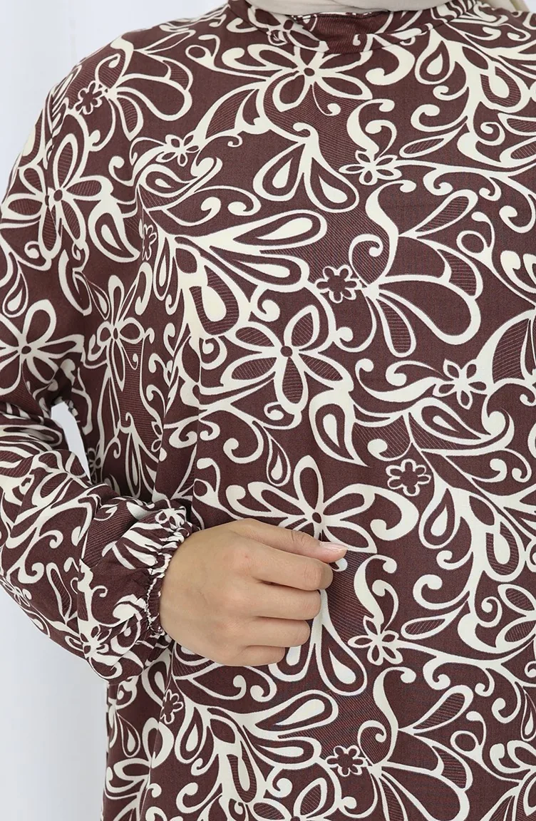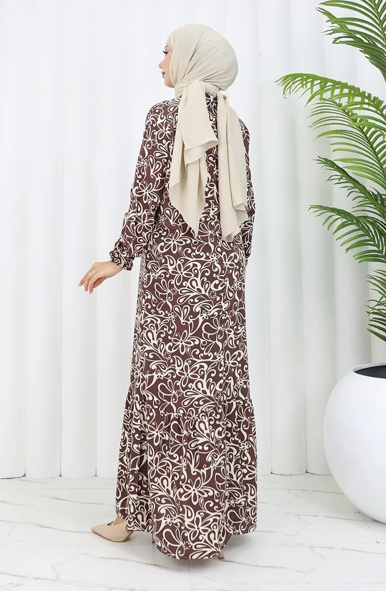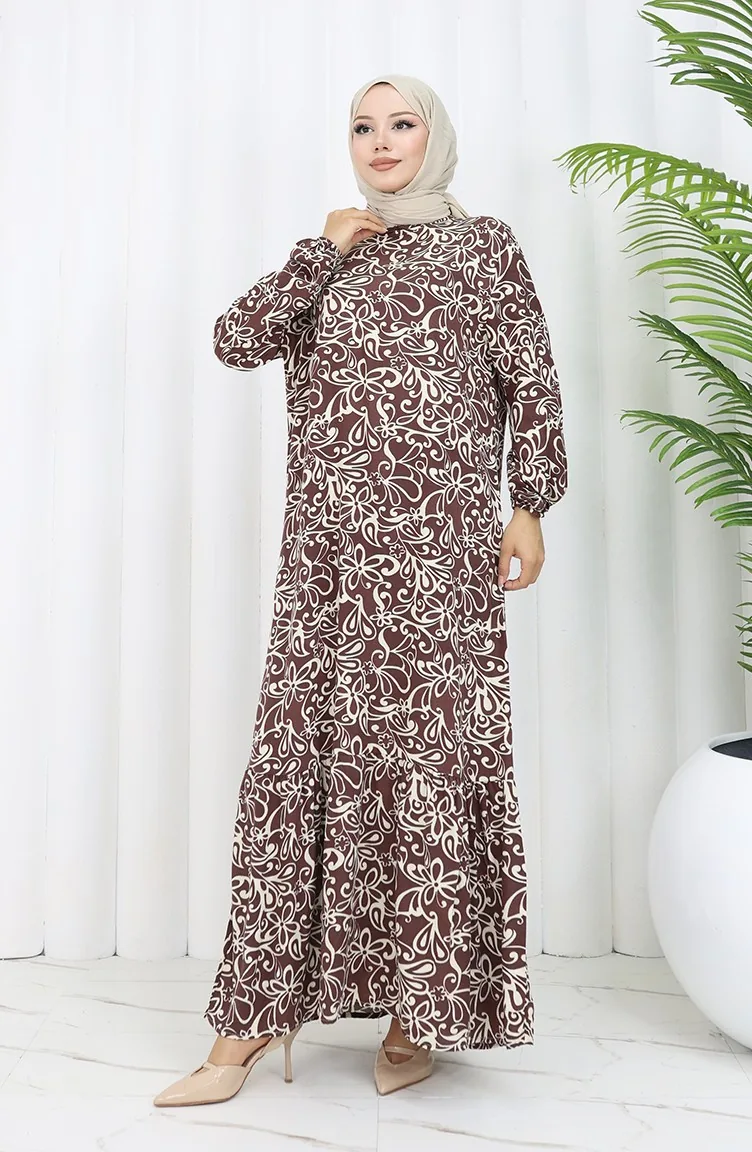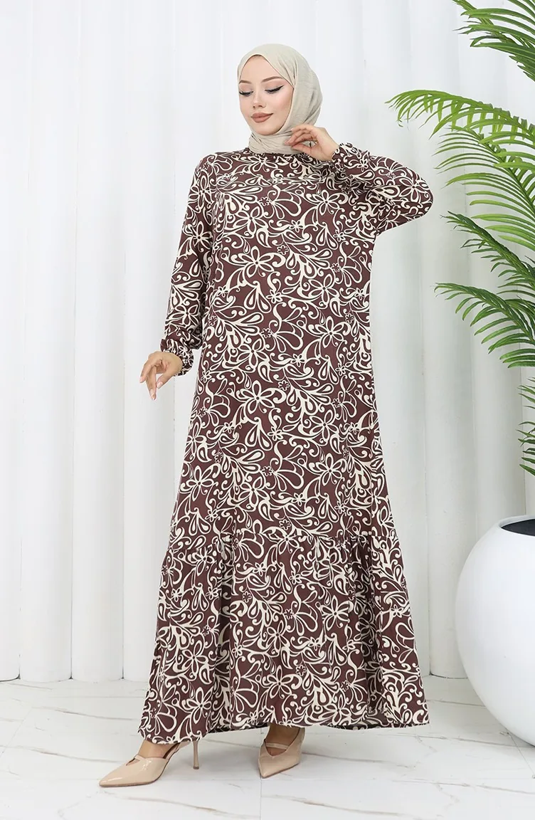 Viskon Kumaş Kolu Lastikli Desenli Elbise 2036-04 Kahverengi