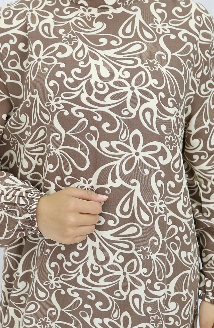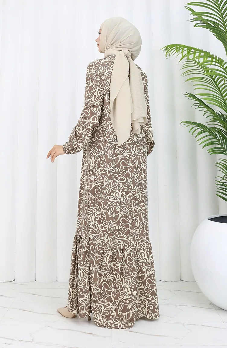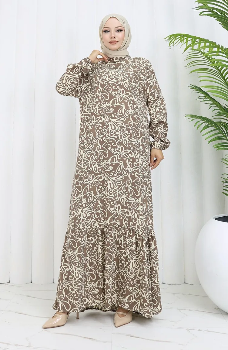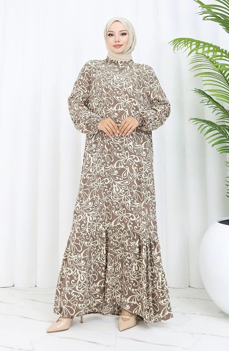 Viskon Kumaş Kolu Lastikli Desenli Elbise 2036-05 Vizon