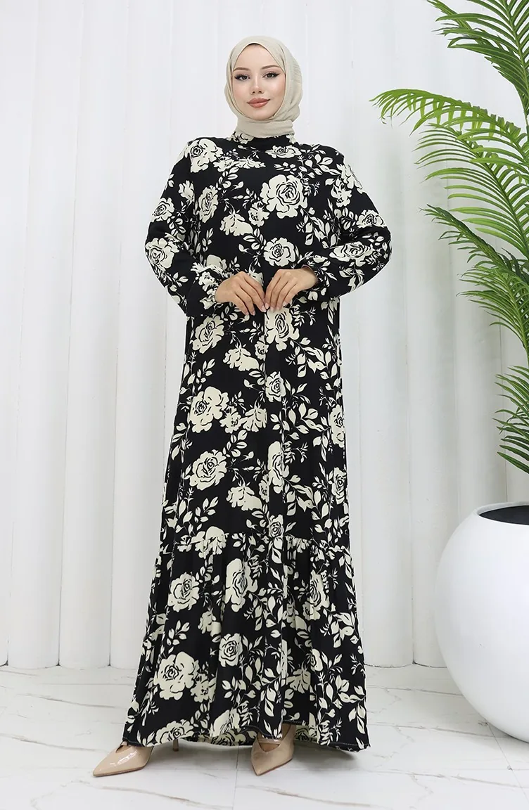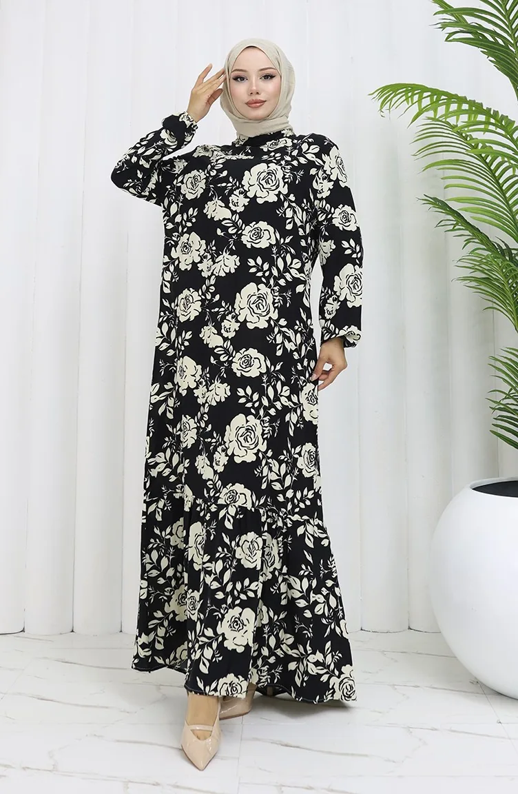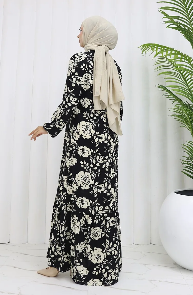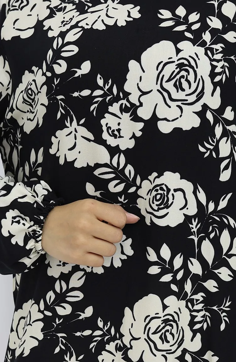 Viskon Kumaş Kolu Lastikli Desenli Elbise 2037-01 Siyah